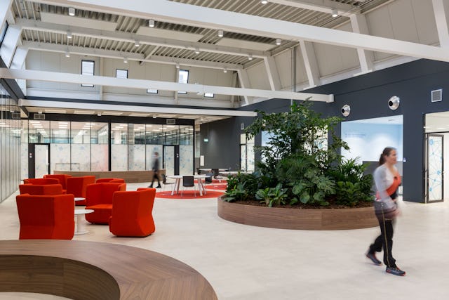 Het ontwerpbureau zag juist in dit verhoogde dak de potentie om de ruimte om te toveren in een plek waar studenten en docenten graag komen om te werken en te studeren. Onder het verhoogde dak is een centraal studentenplein gerealiseerd, die tevens de ontvangsthal is voor iedereen die binnenkomt. Centraal op het plein staat een grote tuin die, samen met de speciaal ontworpen inrichting, een exterieure kwaliteit verleent aan de introverte ruimte. Hierdoor wordt het mogelijk om rond het plein onderwijslokalen en kantoorruimten te organiseren.