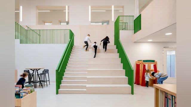 Het nieuwe gebouw is georganiseerd rondom een aantal leerclusters met ruimten voor samenwerken, spel, concentratie en rust. Het interieur heeft een natuurlijke uitstraling door het gebruik van hout en metselwerk.
