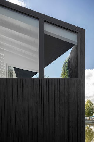 Binnen de gegeven grenzen van elk waterperceel is elke woning uniek in architectuur en interieur. Alle bewoners kozen hun eigen architect. De opdrachtgever daagde ons uit om de ruimte binnen de grenzen van het kavel paspoort te maximaliseren. De drijvende woning heeft een diagonaal gekanteld schuin dak. In de plattegrond resulteert dit in een optimalisatie van de bruikbare ruimte en een mooi terras, maar het geeft de woning ook zijn karakteristieke architectonische vorm.