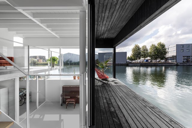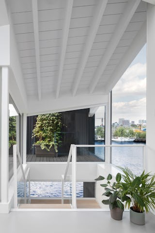 De drijvende woning kenmerkt zich door een dynamische variatie van ruimtes zowel binnen als buiten. Alle ruimtes staan in open verbinding met het atrium dat uit drie verdiepingen bestaat. De indeling voorziet in een split level verbinding naar een loggia terras net boven het waterniveau. Bewegend door de woning verschijnen telkens verschillende perspectieven en uitzichten. Het woongedeelte op de bovenste verdieping heeft een aangrenzend semi-gesloten terras.