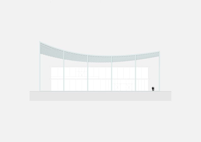 Het staal van het luifeldak lijkt bijna gewichtloos door het te poedercoaten in een lichte, blauwe kleur: de kleur van de hemel. Als een elegant statement staat het op slanke kolommen poten van slechts 45 cm breed en buigt het in de hoeken omhoog als vriendelijk gebaar naar zowel bezoekers als het naastgelegen meer.