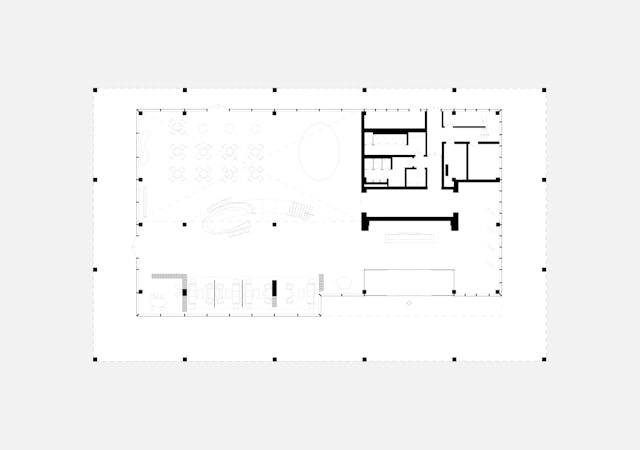 De donkere horizontale lijnen leggen vervolgens het glazen paviljoen stevig vast in de grond eronder. De dakconstructie is ter plaatse aan elkaar gelast – de gebogen delen zijn geprefabriceerd – en vervolgens met de hand afgewerkt tot een glad gepolijste oppervlak. Hetzelfde hoge afwerkingsniveau is toegepast op de vrijwel naadloze glazen gevel van het paviljoen.