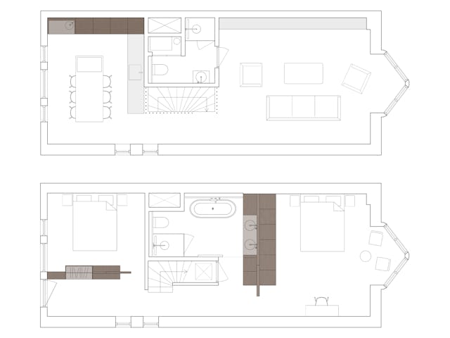 De opdracht bij deze verbouwing was om de bestaande maisonnette-woning beter vorm te geven en in te delen. Beide verdiepingen zijn hiervoor integraal aangepakt. De bovenste laag is hierbij als woonverdieping ingericht en de onderste laag als entree en slaapverdieping. Om de woning zo vrij en open mogelijk in te kunnen delen, zijn de meeste binnenwanden verwijderd. Deuren zijn vervangen door verdiepingshoge schuifdeuren.