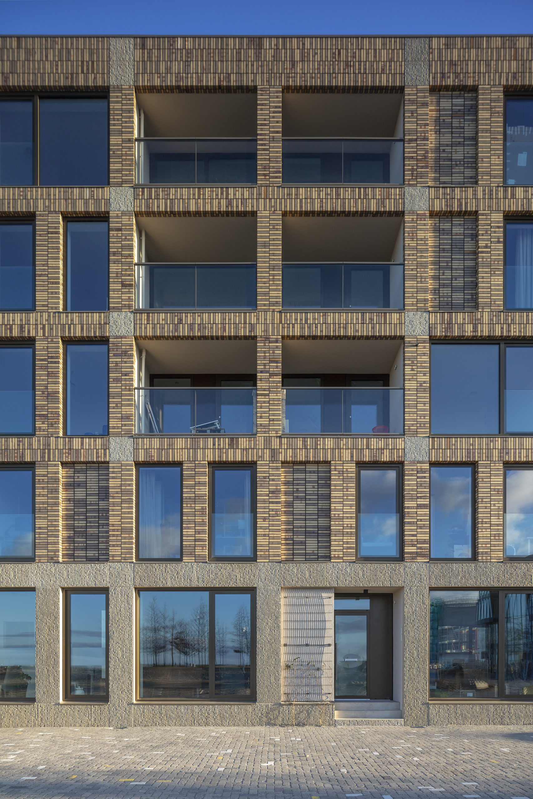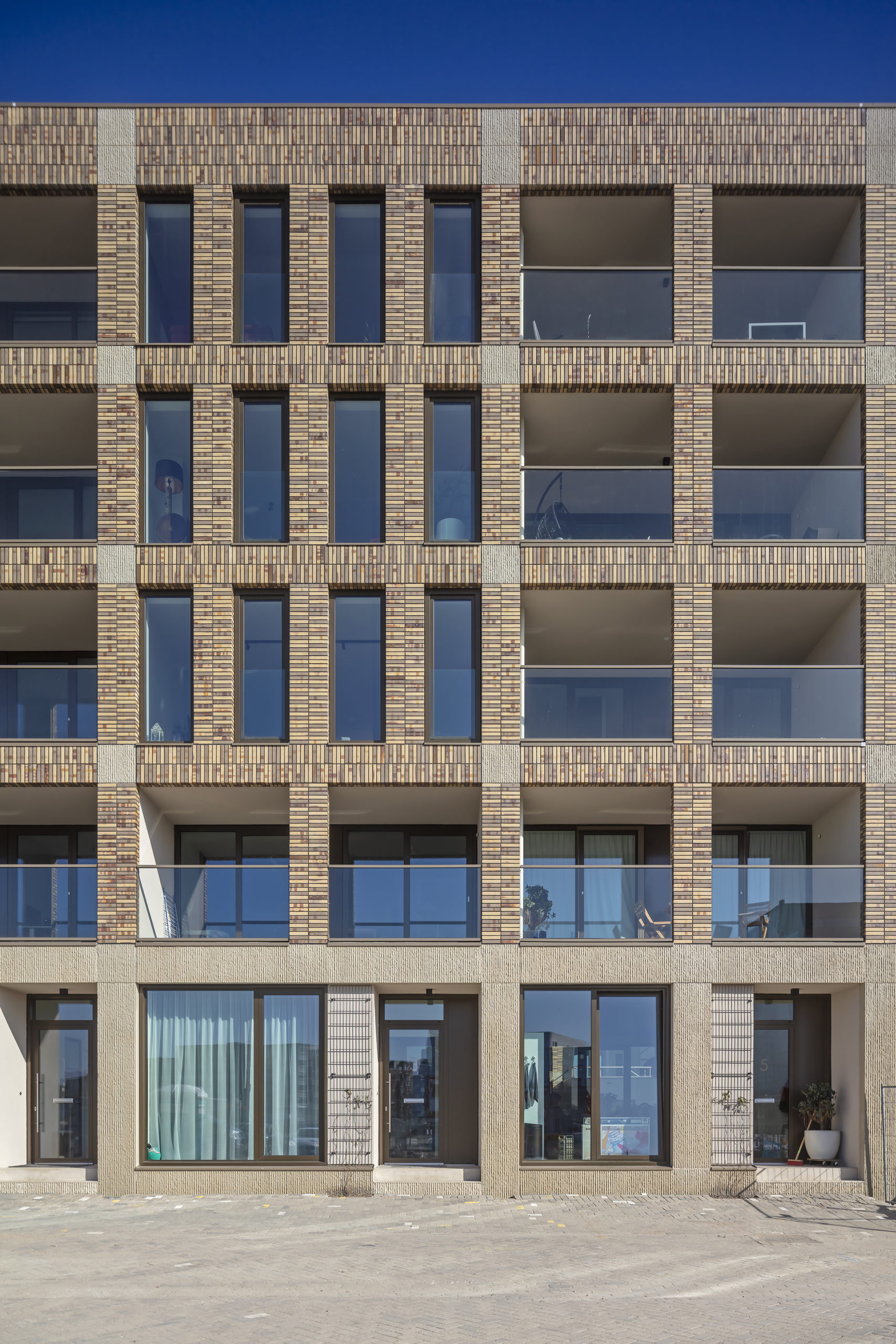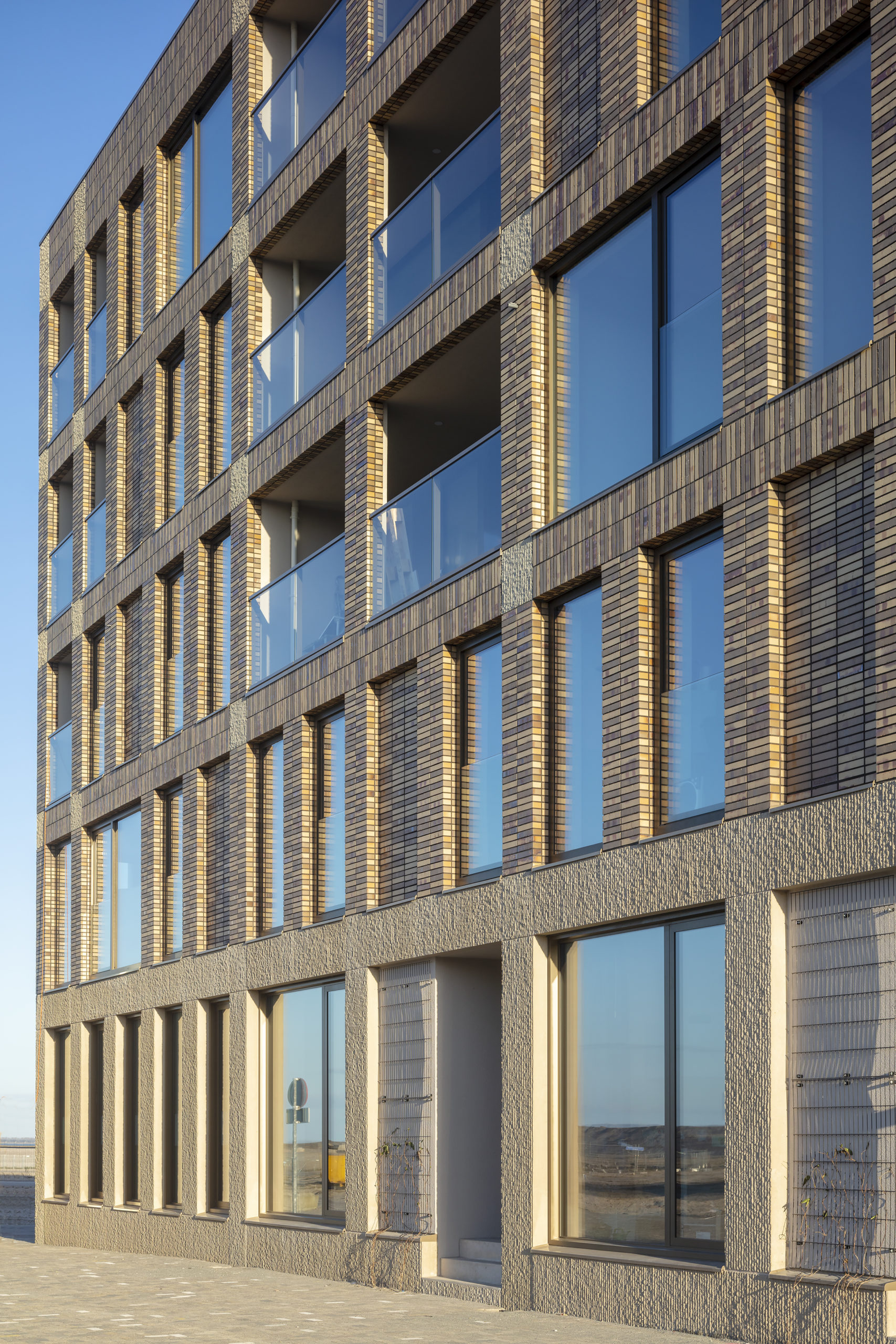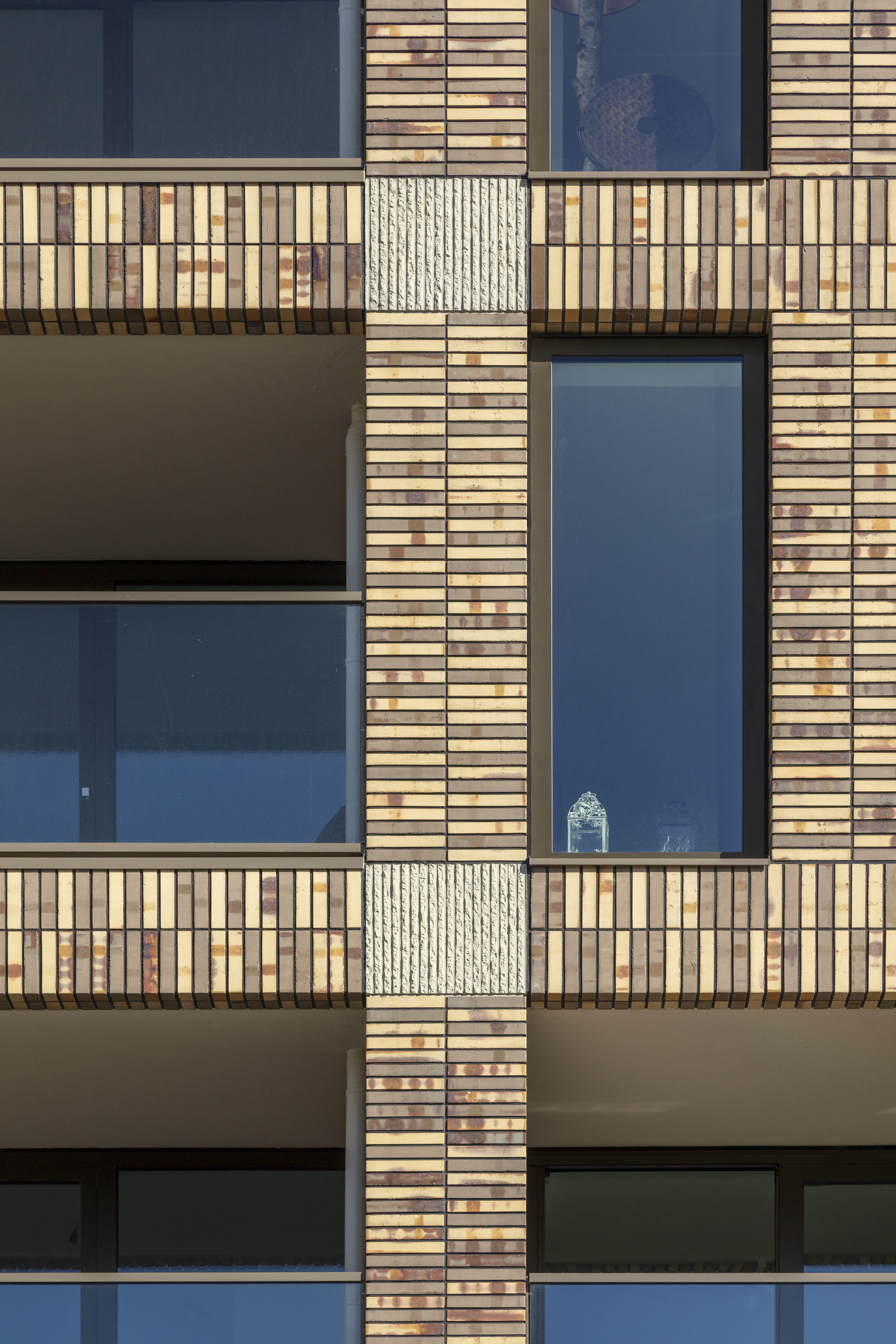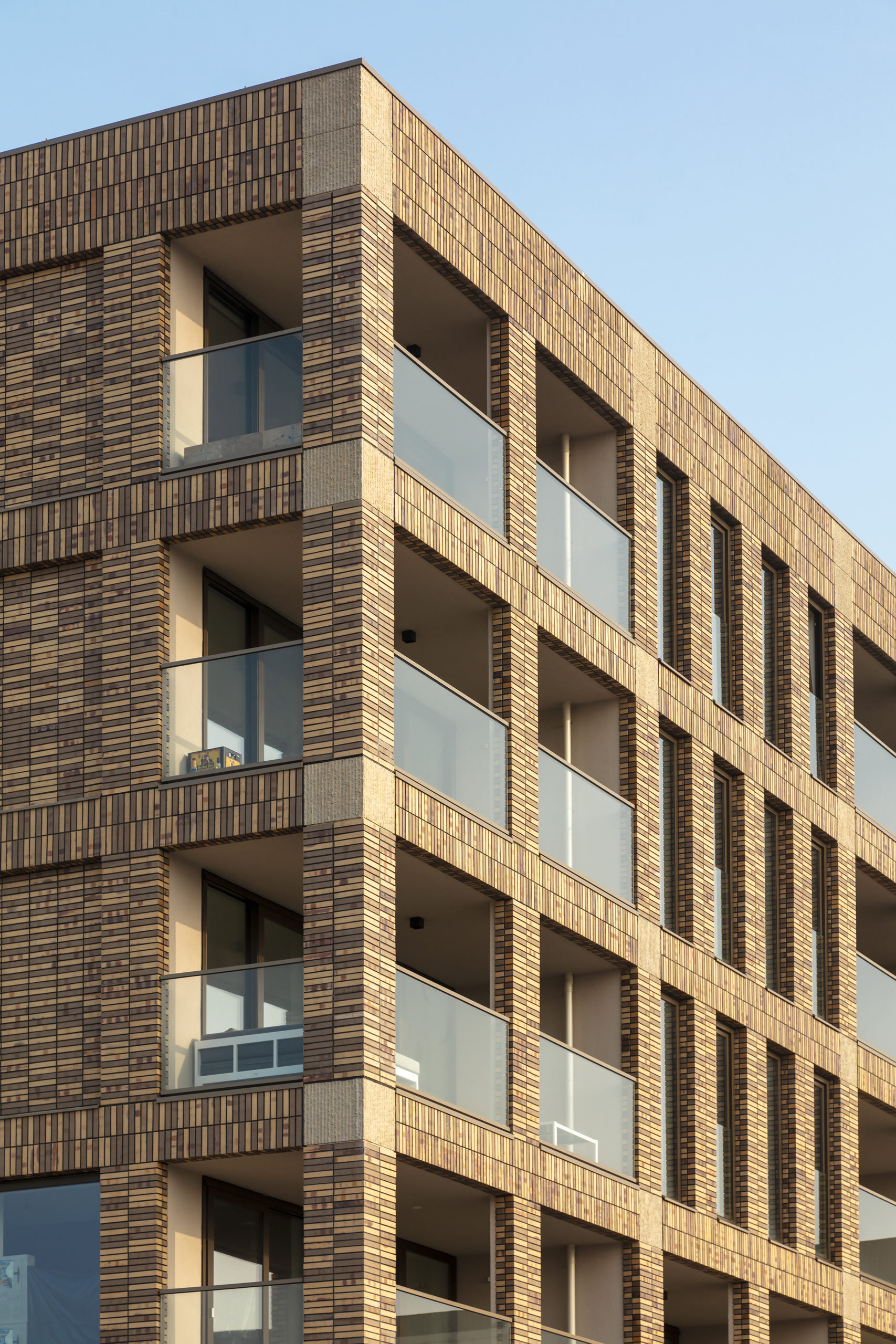 De gemêleerde Hagemeister sortering “IJburg” is speciaal voor dit project samengesteld en bestaat uit zand- en bruinkleurige bakstenen, die met hun kleur refereren aan het eiland en aan het nabijgelegen stadsstrand. De stenen hebben gesinterde accenten die wat ruwer en donkerder zijn, gecombineerd met gladde delen. De stenen zijn afwisselend met voor- en fusszijde als hoek steenstrip meegestort in de prefab geveldelen. Dit geheel maakt het uiteindelijke karakter van de gevels.