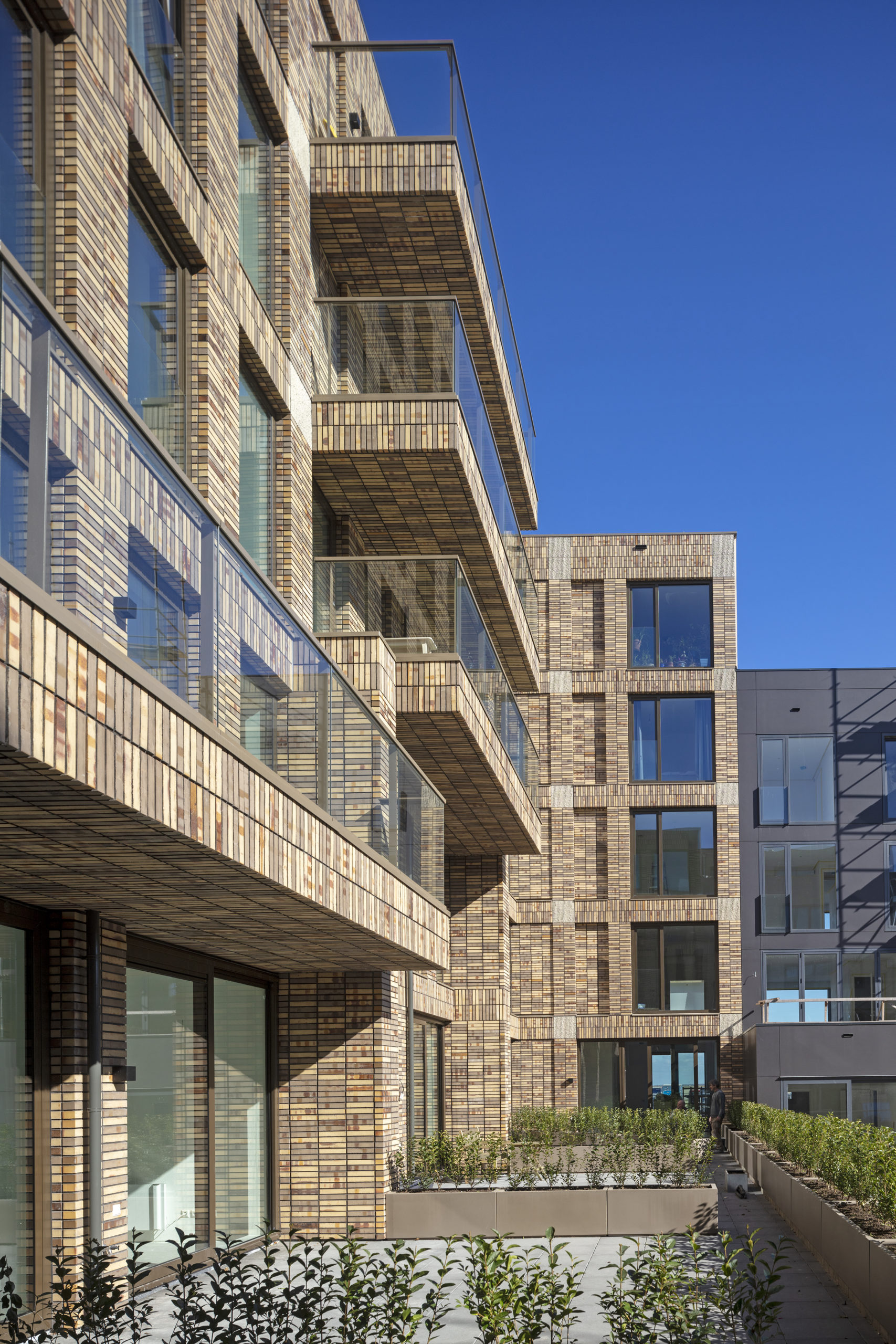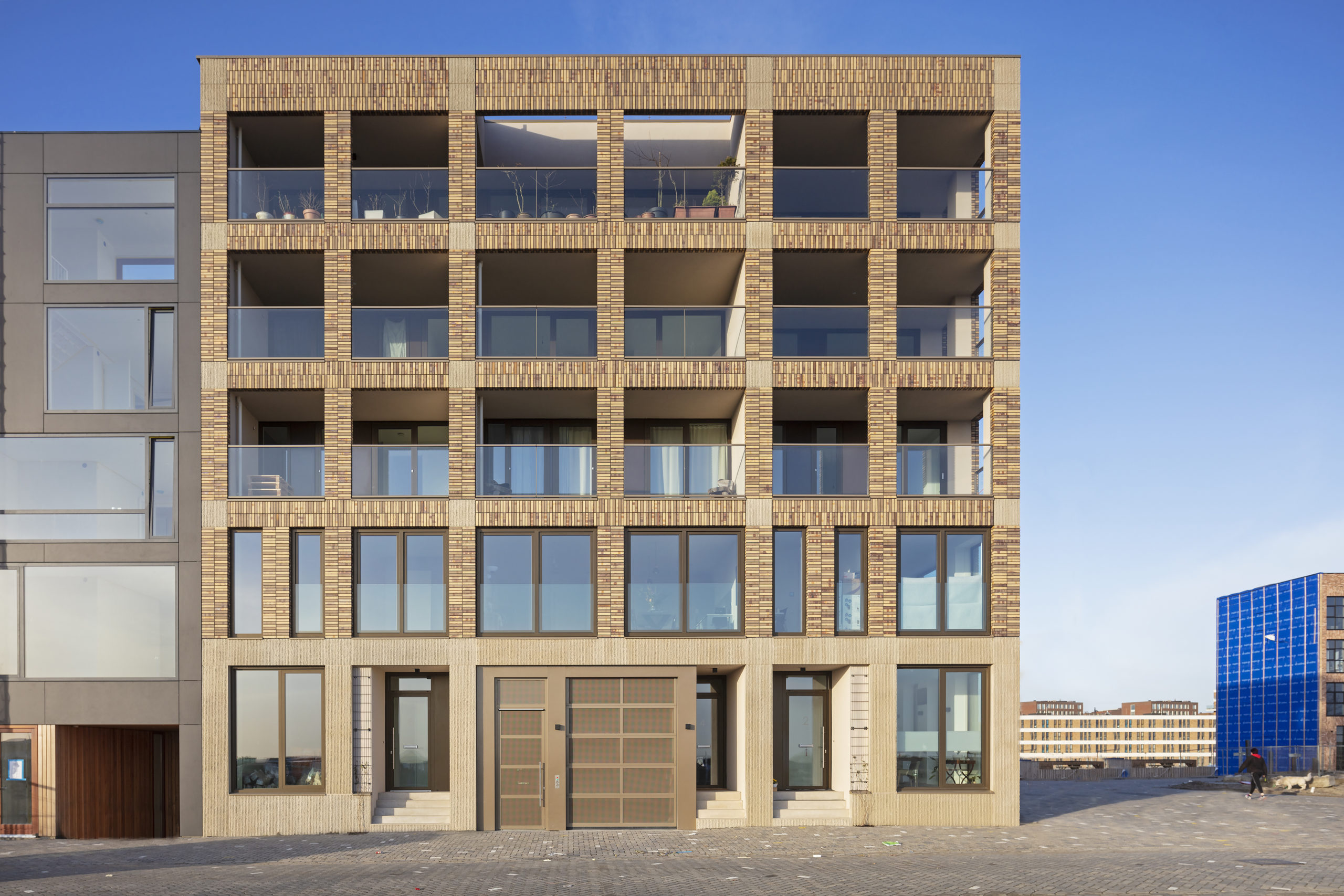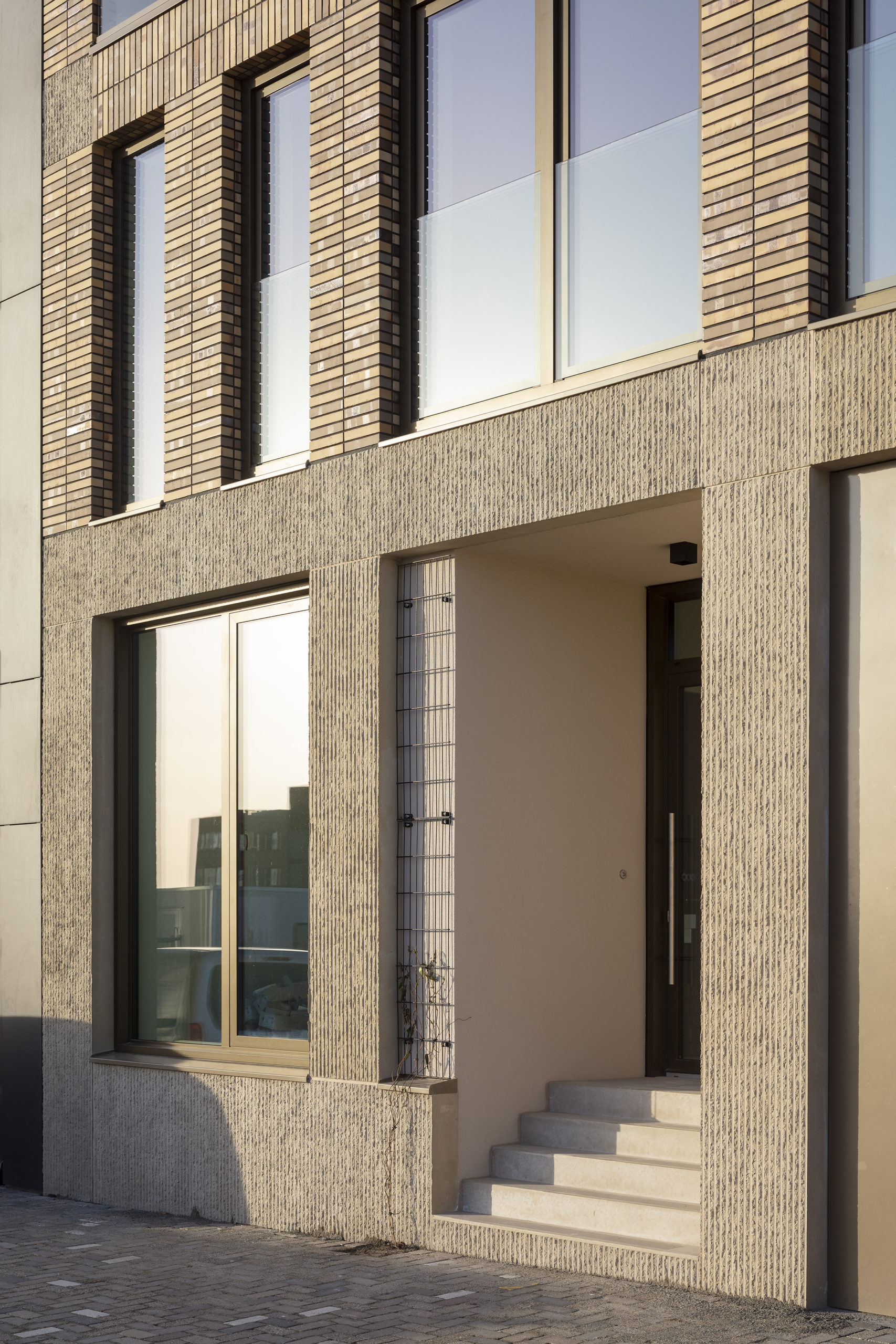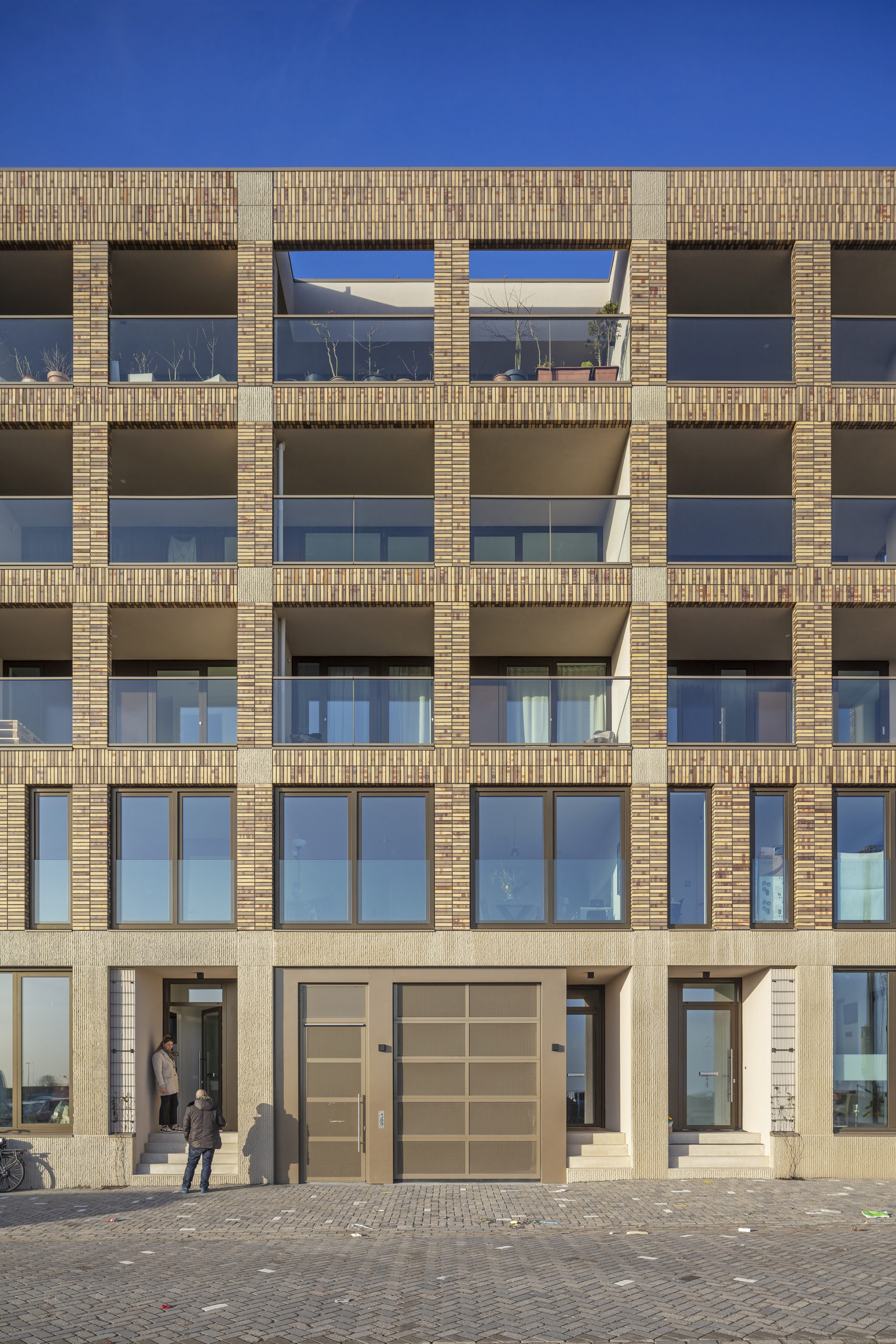 De gemêleerde Hagemeister sortering “IJburg” is speciaal voor dit project samengesteld en bestaat uit zand- en bruinkleurige bakstenen, die met hun kleur refereren aan het eiland en aan het nabijgelegen stadsstrand. De stenen hebben gesinterde accenten die wat ruwer en donkerder zijn, gecombineerd met gladde delen. De stenen zijn afwisselend met voor- en fusszijde als hoek steenstrip meegestort in de prefab geveldelen. Dit geheel maakt het uiteindelijke karakter van de gevels.