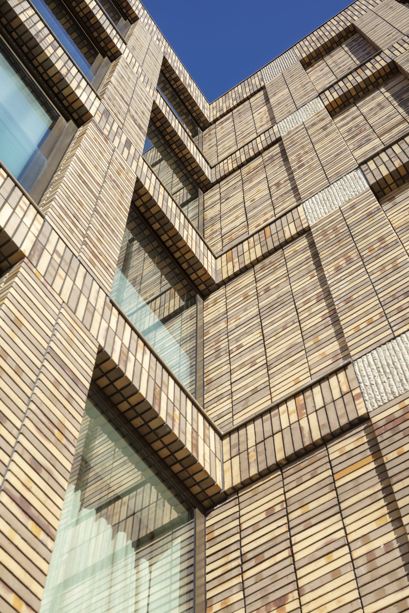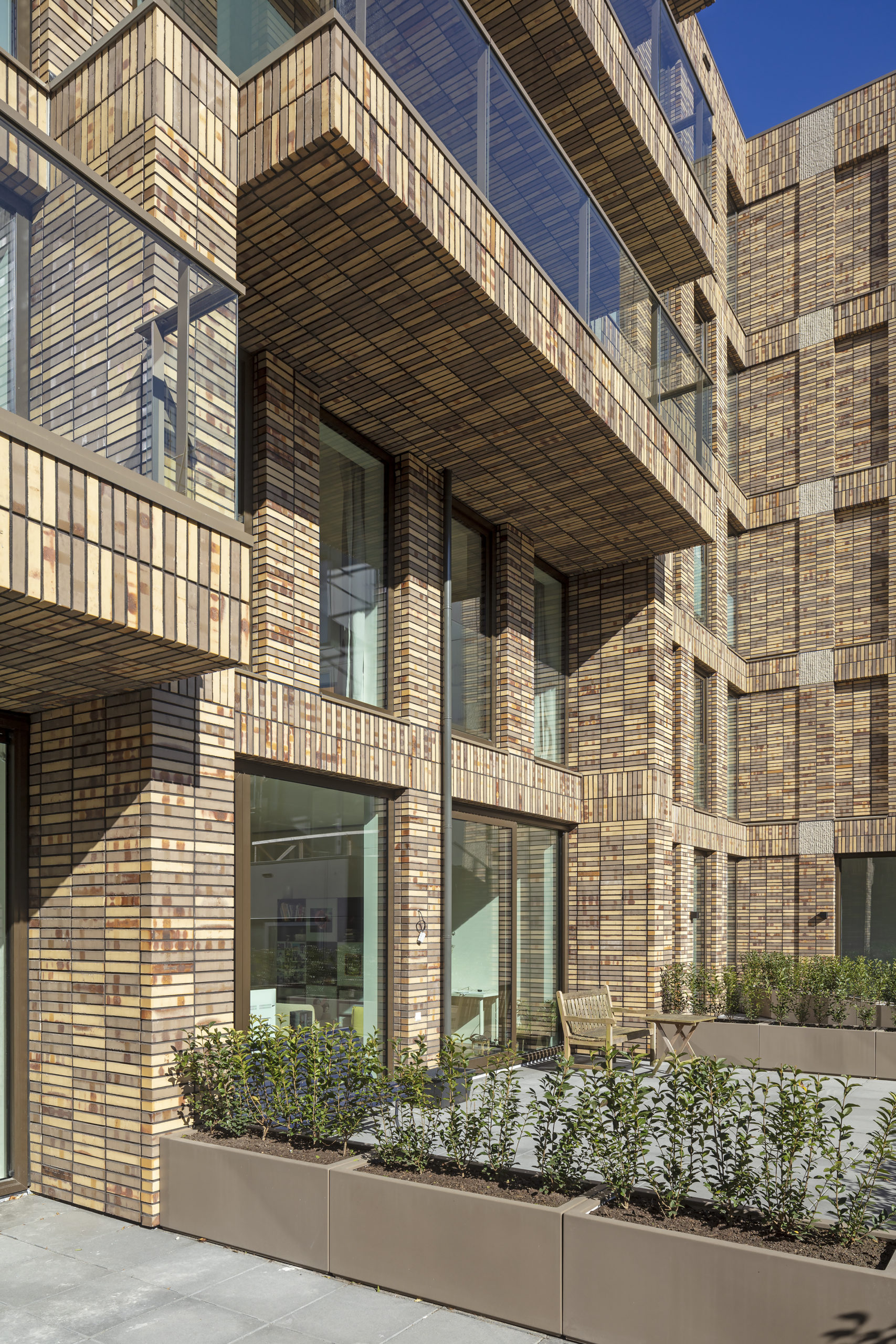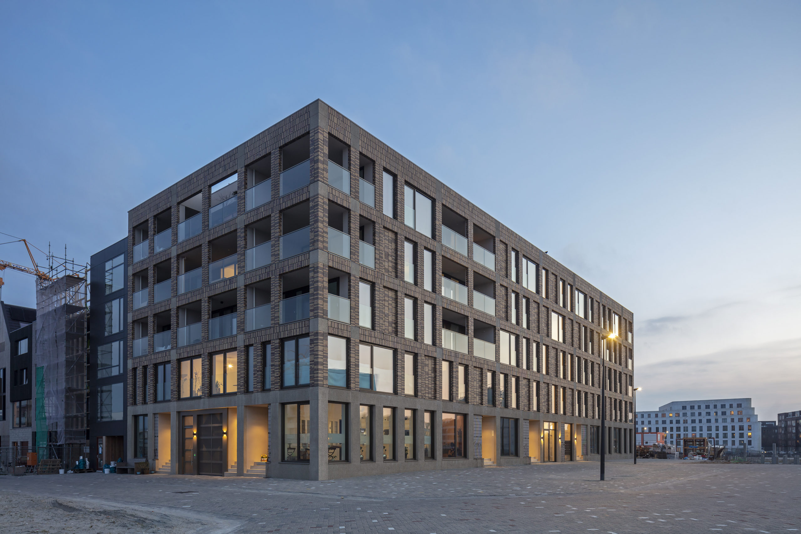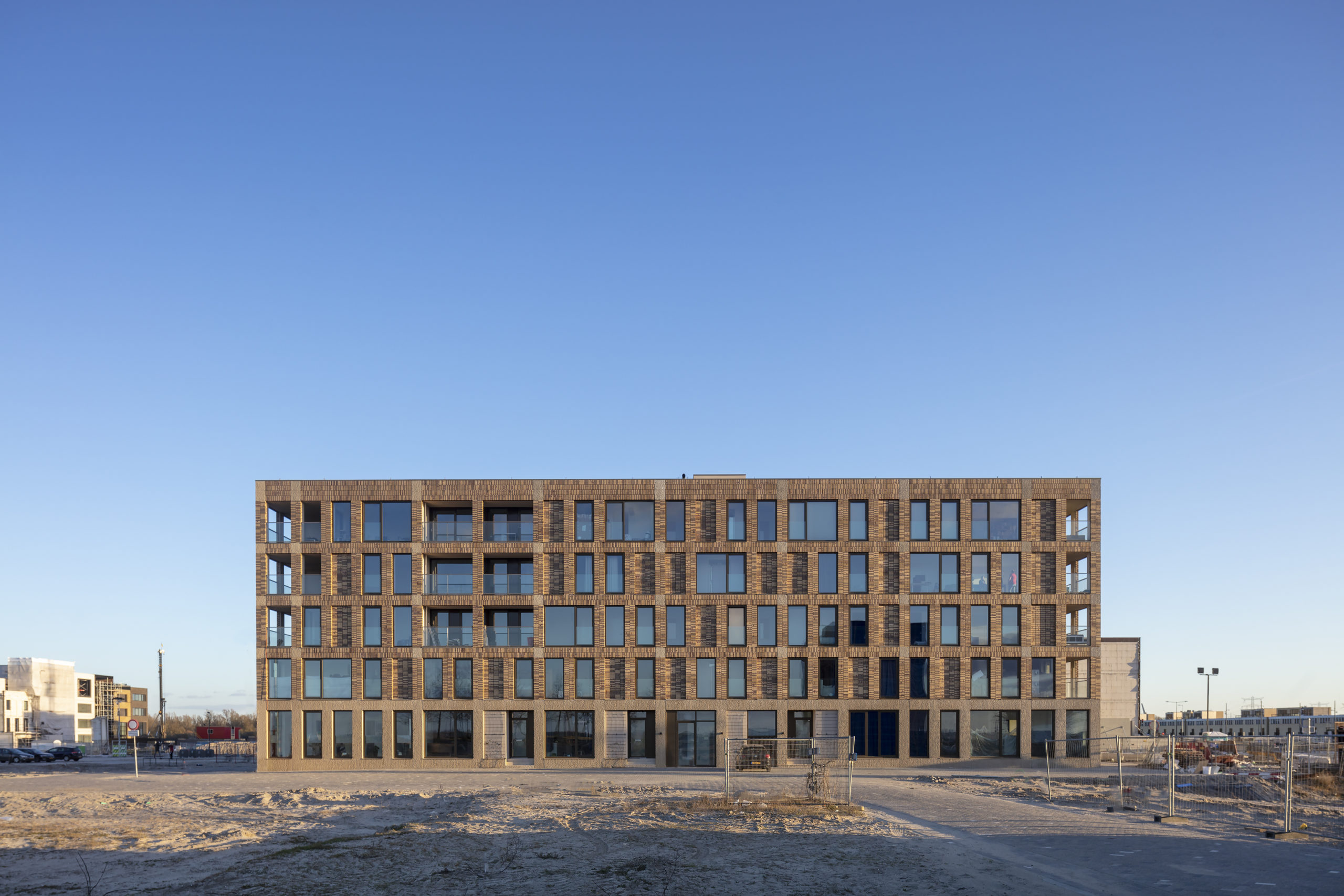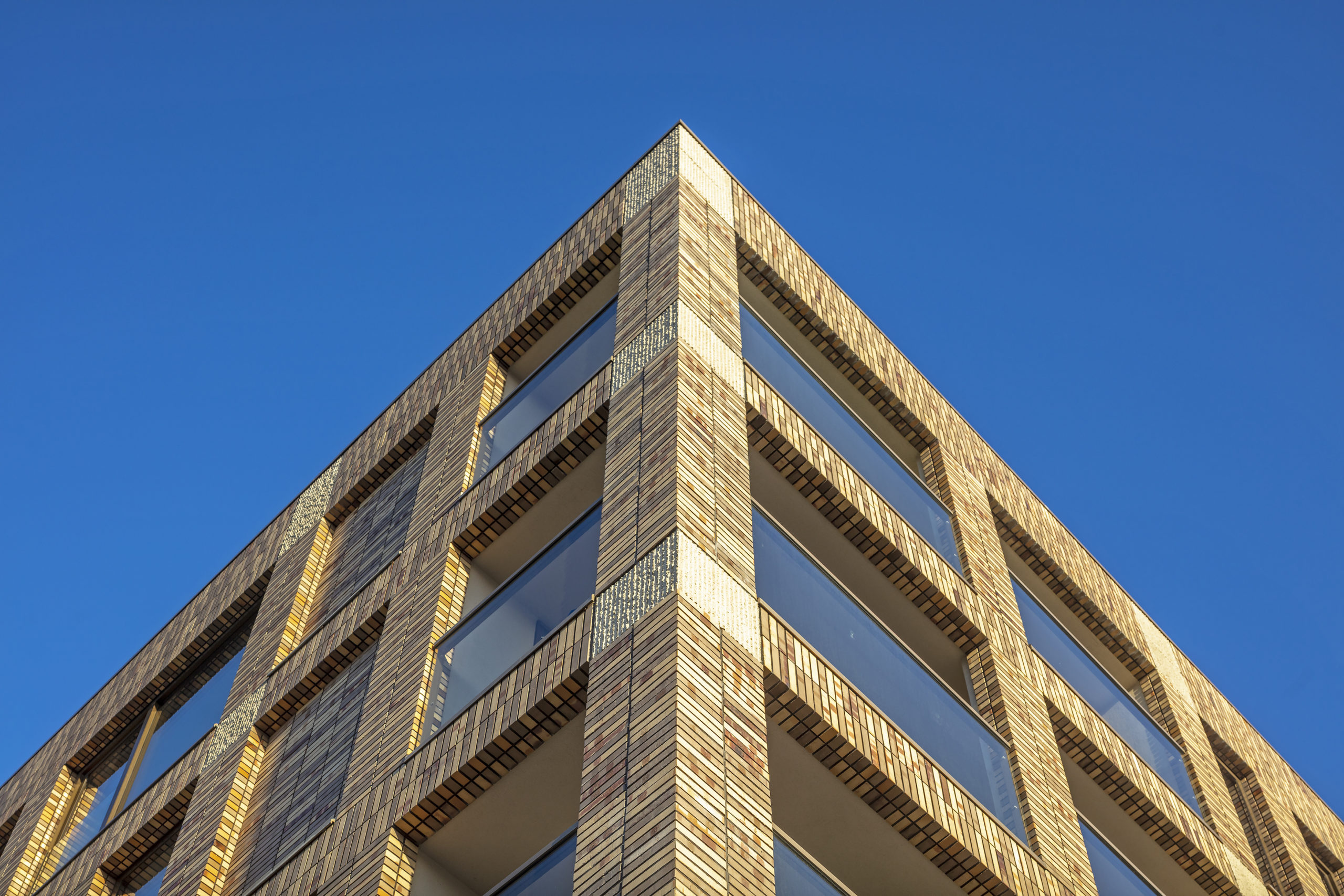 De gemêleerde Hagemeister sortering “IJburg” is speciaal voor dit project samengesteld en bestaat uit zand- en bruinkleurige bakstenen, die met hun kleur refereren aan het eiland en aan het nabijgelegen stadsstrand. De stenen hebben gesinterde accenten die wat ruwer en donkerder zijn, gecombineerd met gladde delen. De stenen zijn afwisselend met voor- en fusszijde als hoek steenstrip meegestort in de prefab geveldelen. Dit geheel maakt het uiteindelijke karakter van de gevels.