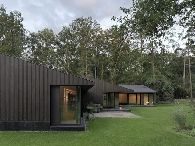 De bijzondere configuratie voorziet een ruimtelijk spel van bijzondere plekken met verschillende hoogtes en oriëntatie. De gevel is vervaardigd van houten latten met een natuursteen plint. Het huis als geheel is op een betonnen sokkel geplaatst en toont zich ‘te gast’ in het bos.
