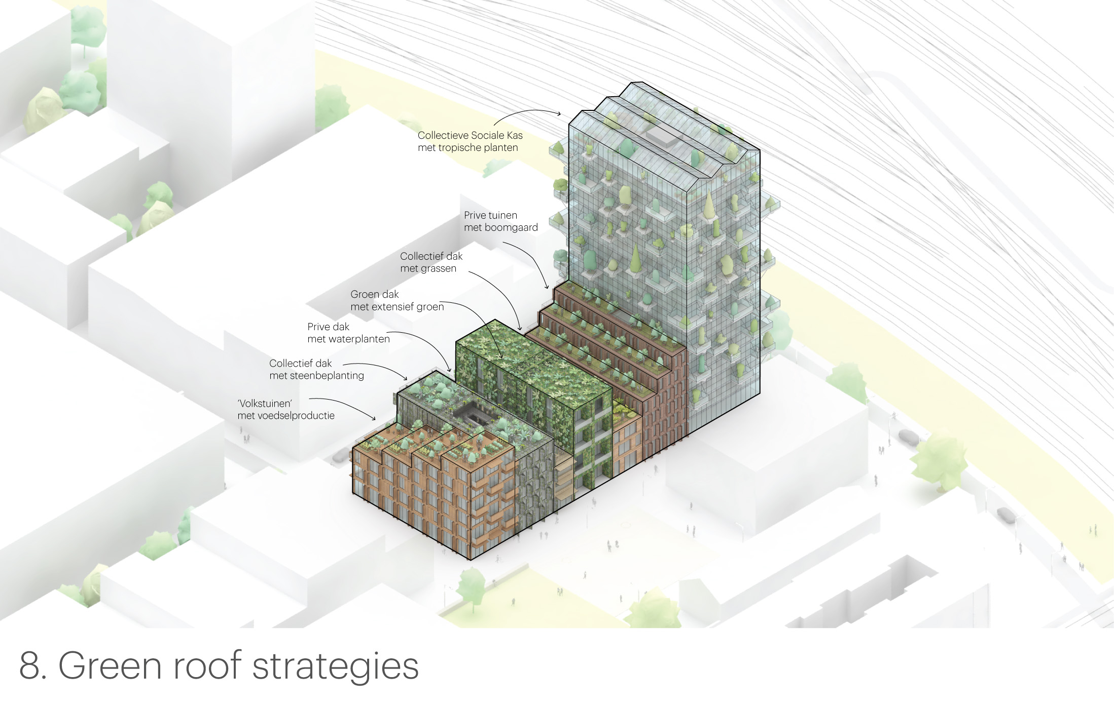 Elk gebouw heeft zijn eigen groene uitstraling en naam – de kas, het vogelhuis, de rots, het huis, de imker, de tuin, de klont – en een gevel die bijdraagt aan vergroening van de stad. Het hele project kan worden gezien als een groen laboratorium, of groene expo. Naast ‘onzichtbare’ technische oplossingen om zeer lage uitstoot te genereren zijn er ook talloze praktische ingrepen om tot een holistische duurzame visie te komen.