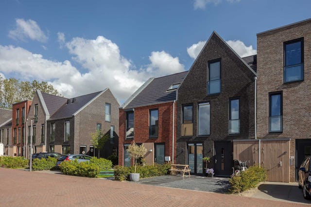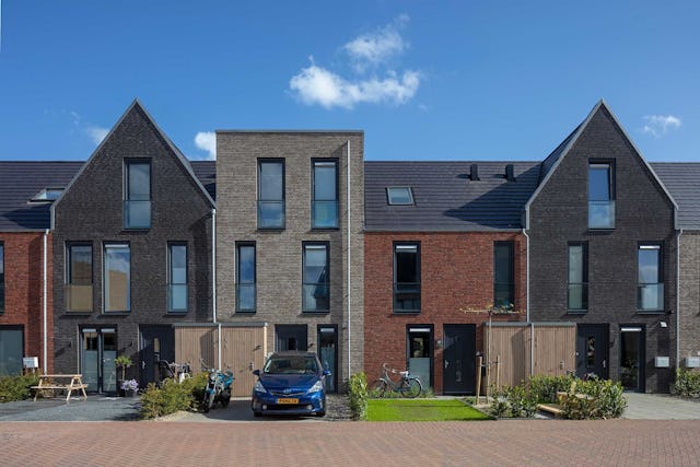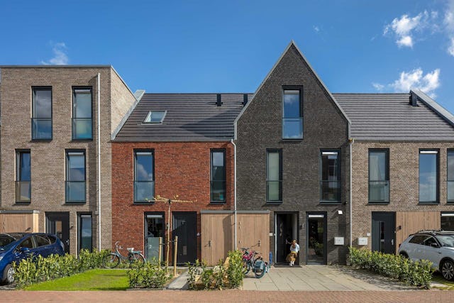De uitstekende fietsbergingen in de voorgevels van de tussenwoningen hebben een afwijkende houten gevelbekleding, die terugkomt als een vlak in de voorgevels van de hoekwoningen. Daarnaast zijn het dak en de kozijnen in dezelfde chique antraciet kleur uitgevoerd en vormen zij samen met het hout de architectonische verbinding tussen de woningen in het plan. Hierdoor ontstaat een levendig maar harmonieus en ingetogen binnenwereld.