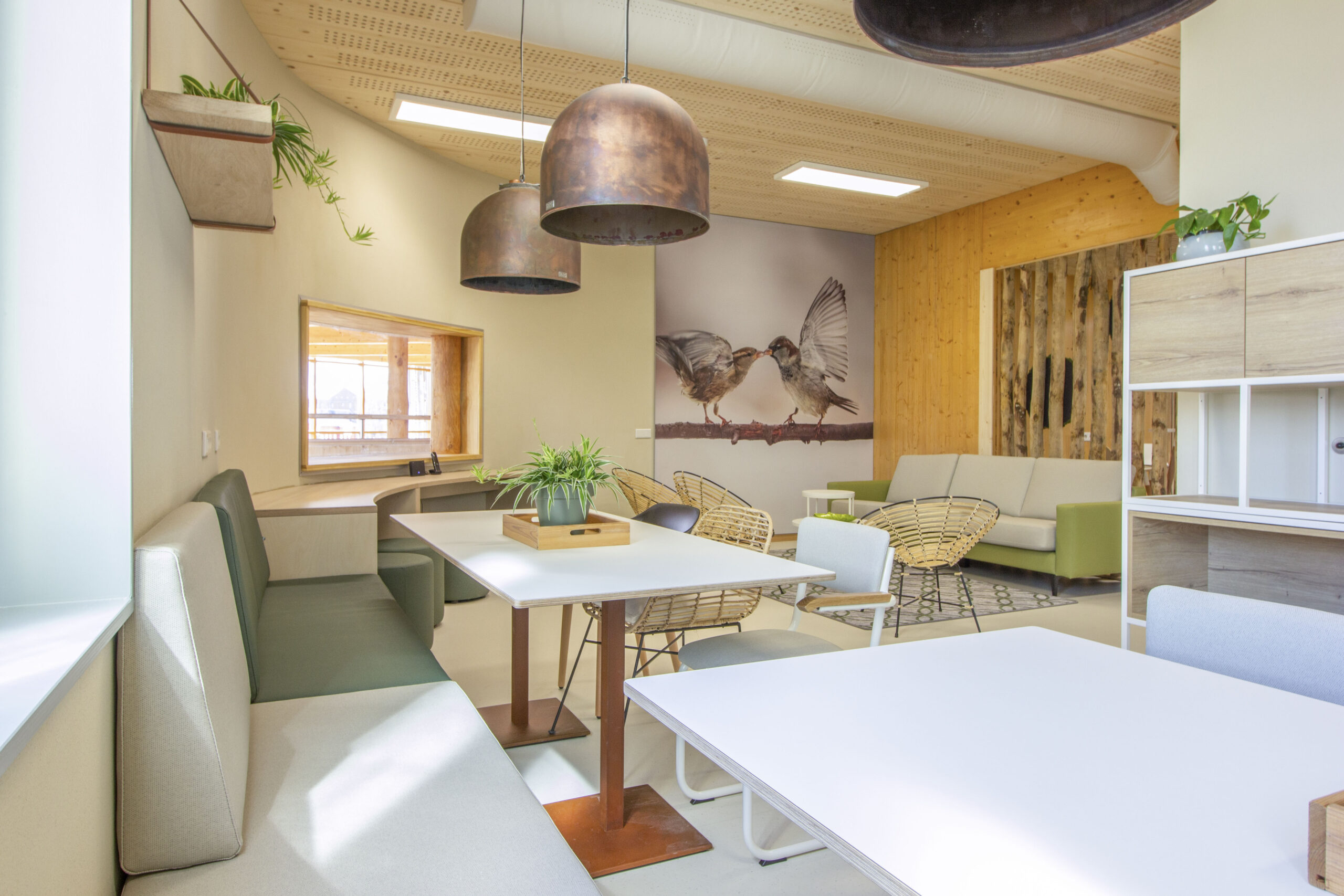 Het casco is hybride van CLT en HSB. Het gebouw is demontabel en innovatief: draagkolommen van geschilde boomstammen, dakconstructie in bladvorm, houten kanaalplaatvloeren, wanden van leemsteen en strobouw. Afwerkingen in hout, groen, kurk en leem. Natuurlijke ventilatie door klimaatluiken en dakluiken. Een ijsbuffervat voor de warmte en koeling en waterhergebruik maakt een A+++ gebouw.