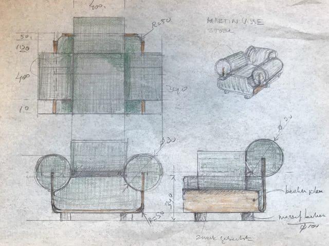 De jubilieumstoel/fauteuil van beukenmultiplex is gestoffeerd. Hij is gemaakt van gebogen beukenmultiplex. De stoel is verkrijgbaar in een gelimiteerde editie van 30 exemplaren, verkrijgbaar in drie kleuren (groen, blauw en grijs).