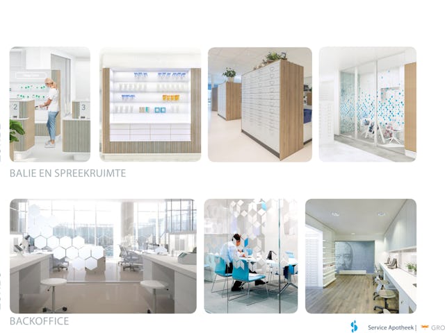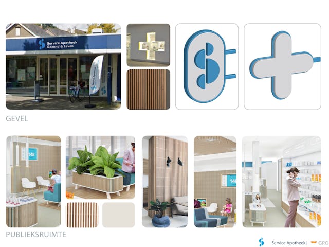 Als oplossing voor de diversiteit van de 500 verschillende Service apotheken, heeft GROUP A een schaalbaar en modulair interieurconcept ontwikkeld. De toolbox bestaat uit interieuronderdelen zoals balies, displays en banken. Bestaand meubilair wordt zo mogelijk hergebruikt en aangepast. In de elementenmatrix wordt de ambitie en maat van de apotheek afgezet tegen de mogelijkheden en investeringen.