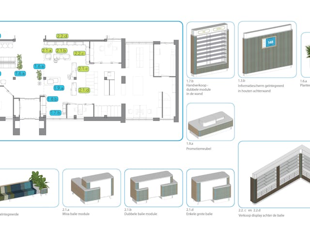 Het modulaire, circulaire en flexibele interieurconcept is toepasbaar op de brede diversiteit aan bestaande apotheken. De interieurelementen die niet conflicteren met het nieuwe interieurconcept worden hergebruikt. Zo worden balies omtimmerd, apothekerskasten voorzien van nieuw folie en banken opnieuw bekleed. Qua gebruik van materialen en grondstoffen heeft hergebruik de voorkeur boven nieuw.