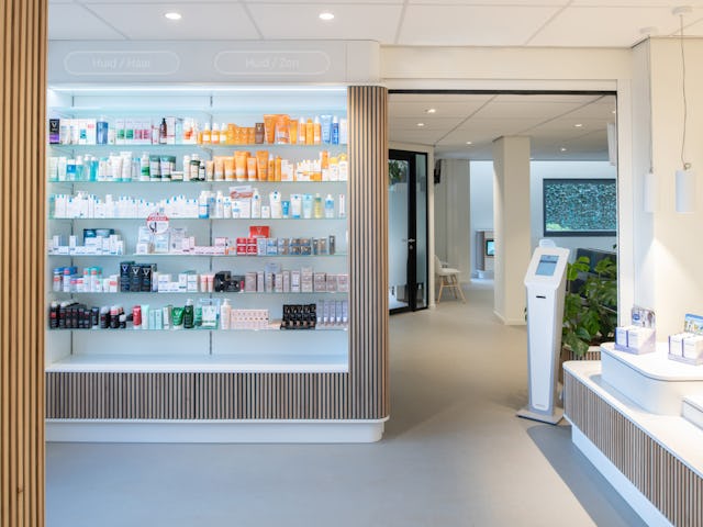 Het interieurconcept wordt gefaseerd geïmplementeerd in de architectuur van de 500 bestaande apotheken. We begeleiden de apotheker bij de inpassing van het zoneconcept en interieurelementen. Hierbij denken we mee in locatie gebonden vraagstukken met als doel de architectuur en interieuridentiteit elkaar te laten versterken. Grafische elementen zijn zorgvuldig geïncorporeerd in het interieur.