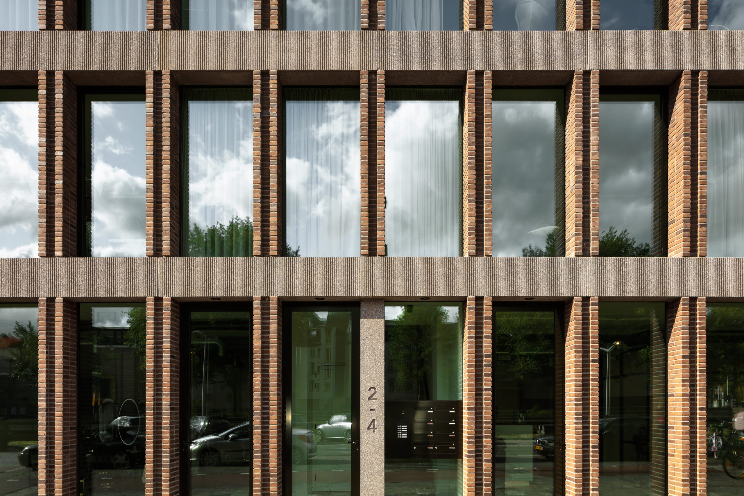 Hoe dichterbij je komt, hoe meer je ziet. Zo is het huisnummer meegenomen in de bekisting waarin het grindbeton is uitgehard. En is gemetseld met de kopse kanten en strekken van de bakstenen. Door het gebouw op een sokkel te plaatsen is het hoogteverschil subtiel opgelost. Om de entree te accentueren is de sokkel daar opgetrokken.