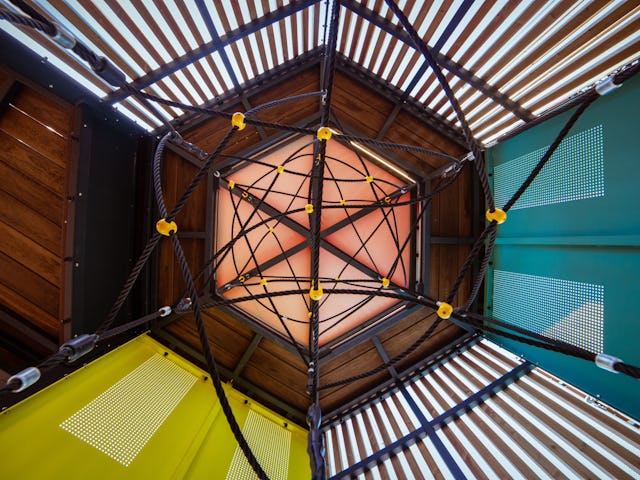 interieur van de torens te ontdekken; een speelwereld van tunnels, trampolines, hangmatten en netten, caleidoscopische kijkers, spiegels, tactiele objecten en touwen en nog veel meer.