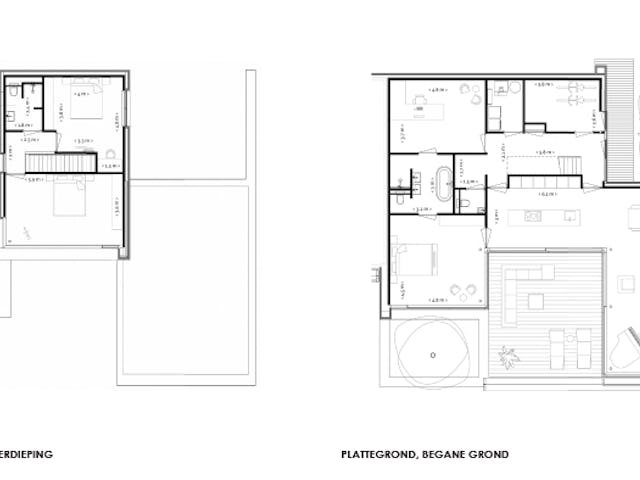 Elke villa beschikt over twee parkeerplaatsen op eigen terrein, vanzelfsprekend ingepast in het meanderende volume van de villa’s.