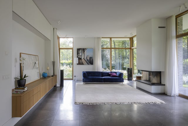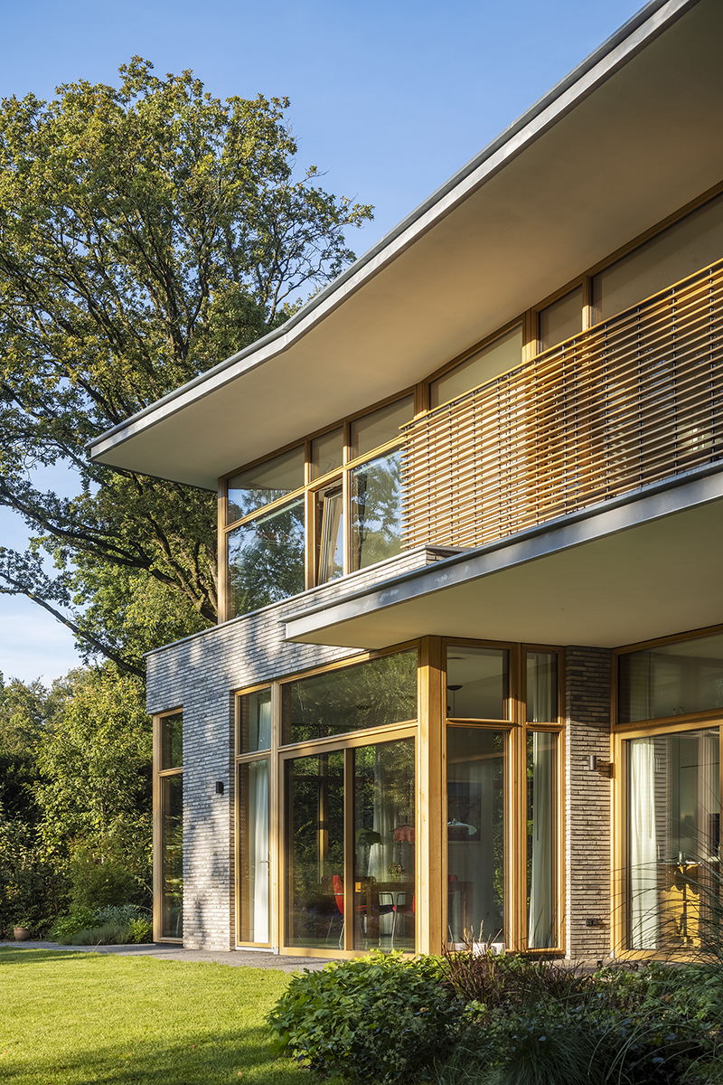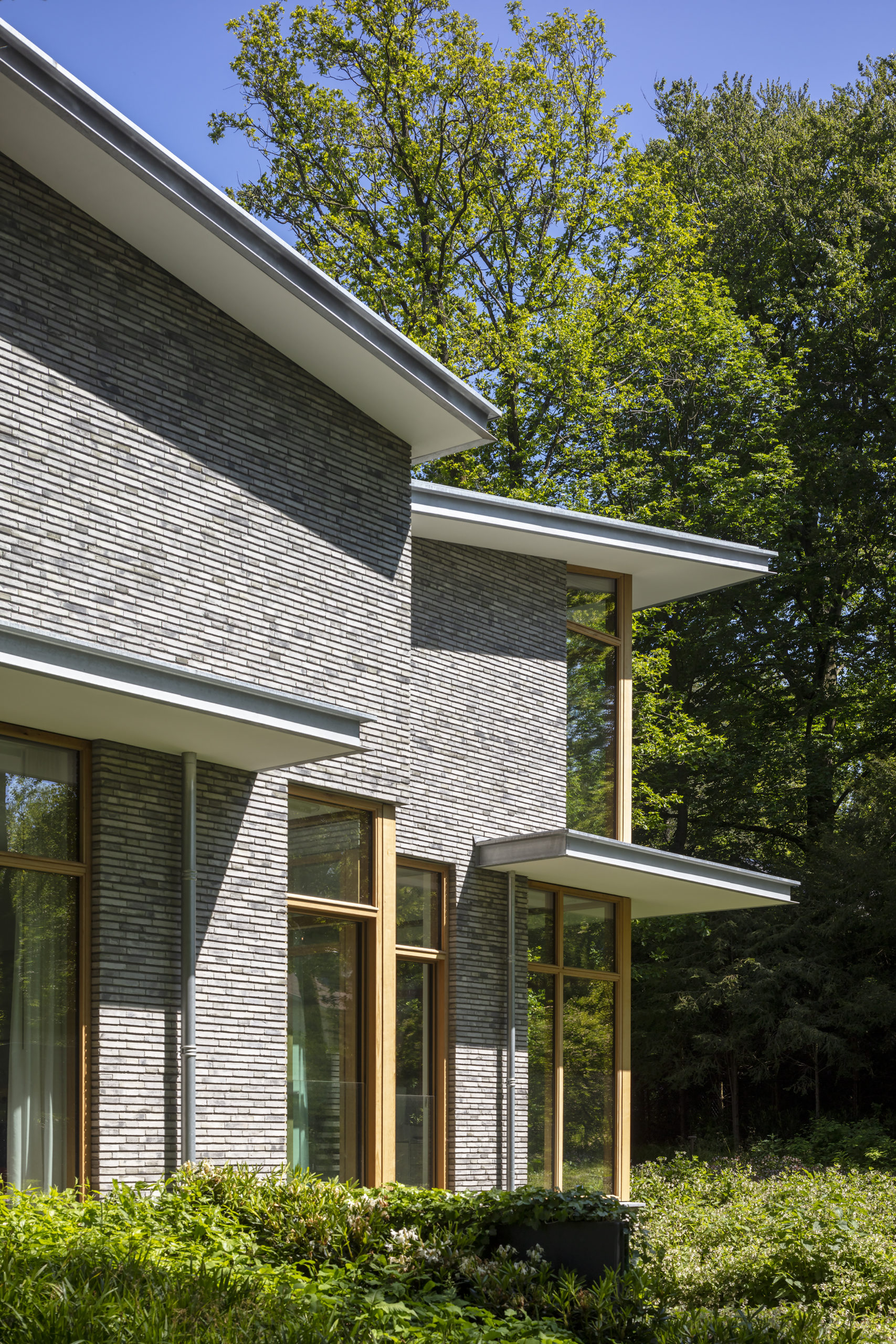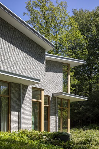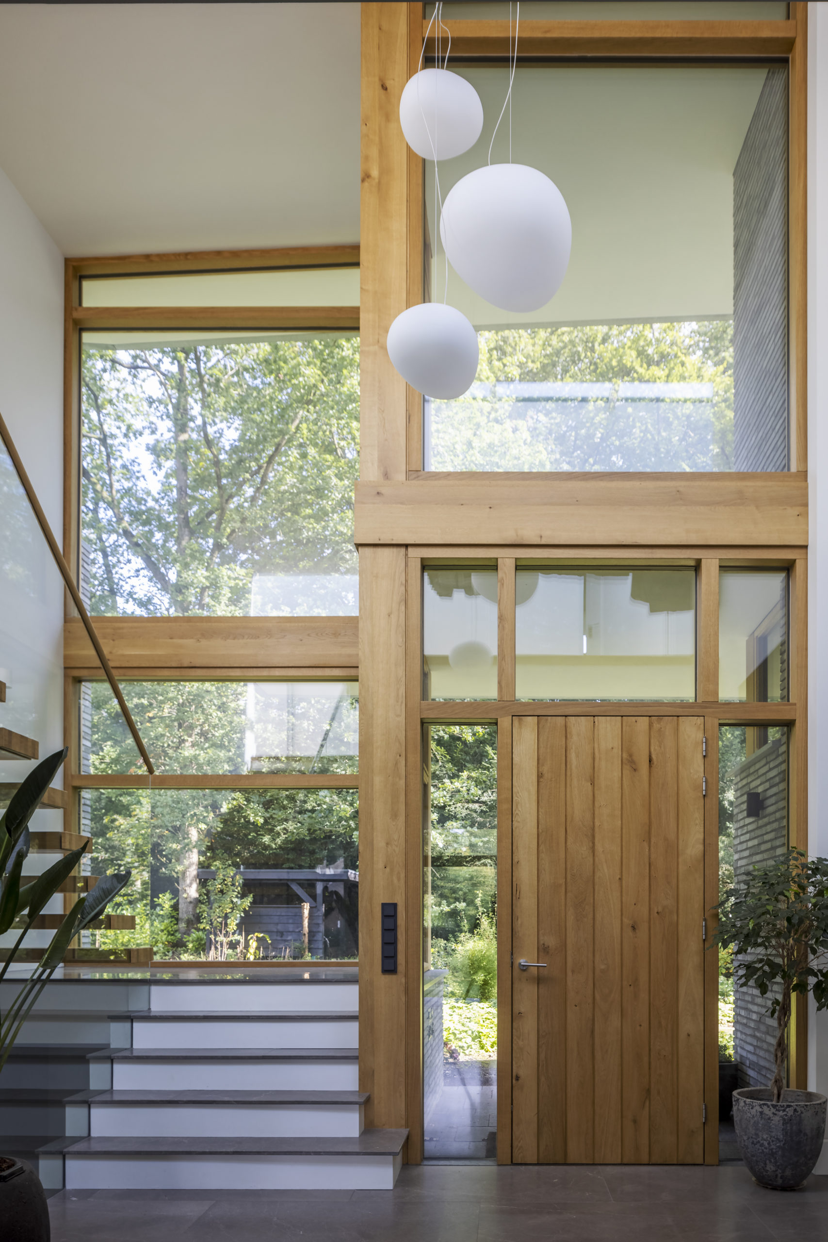De materialisering van het huis is het resultaat van een zorgvuldige afweging van diverse materialen op de kavel zelf. De lichte baksteen waaruit de woning is opgetrokken past perfect in de groene omgeving van het bosperceel. De eikenhouten kozijnen steken daar met hun warme kleuren fraai tegen af.