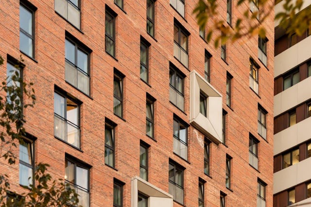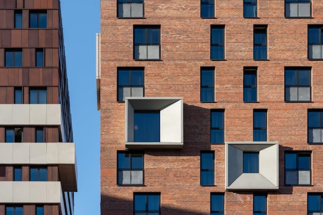 De nieuwe geschakelde woontorens variëren in hoogte en expressie en vormen een gebalanceerde compositie met de Victoriaanse pakhuizen en de voormalige kantoortoren. De horizontale geleding van de woongebouwen bestaat uit een transparante plint afgewerkt met contrasterende metalen strips, een middendeel van rood metselwerk en een daklandschap met ‘Hollandse huisjes’ die ook zijn afgewerkt met metalen strips. In de bakstenen gevels is variatie aangebracht door middel van horizontale banden en verspringende expressieve raamopeningen. Op straatniveau is de gevel soms teruggelegd om comfortabele routes voor voetgangers te creëren.