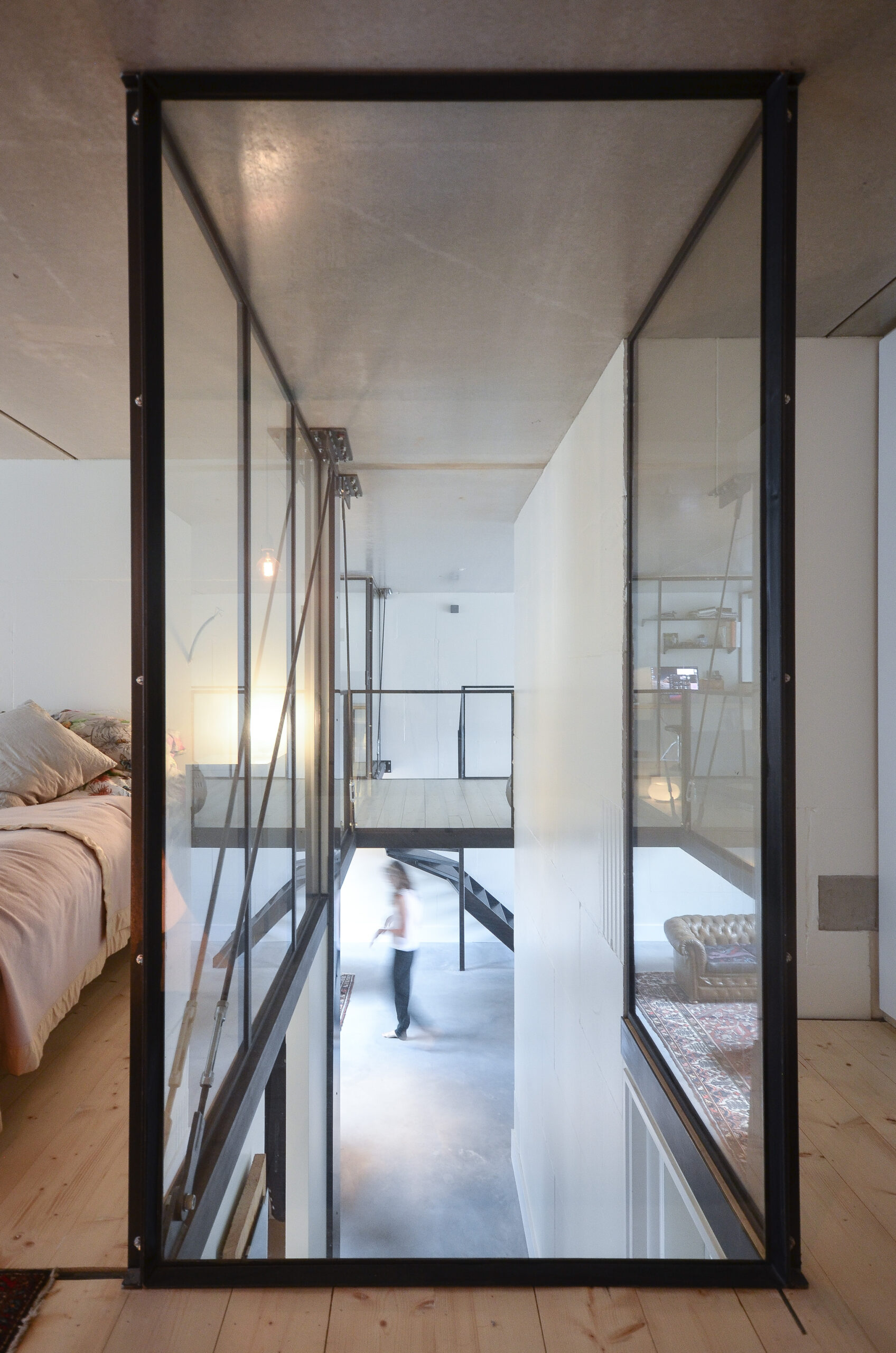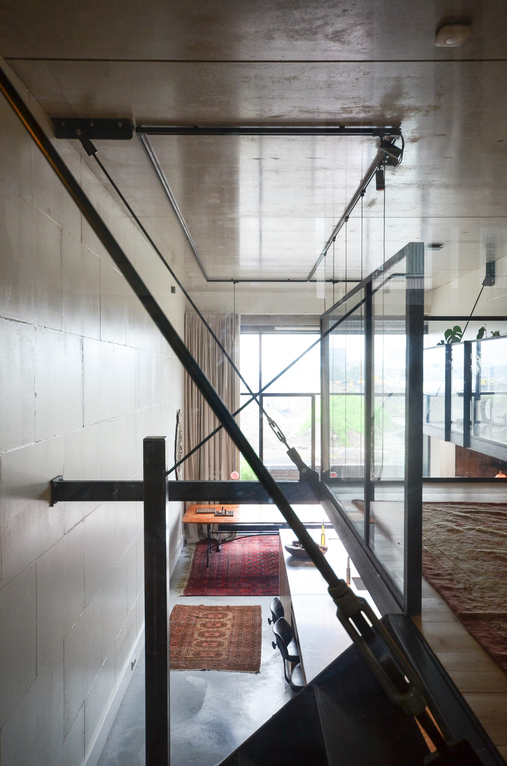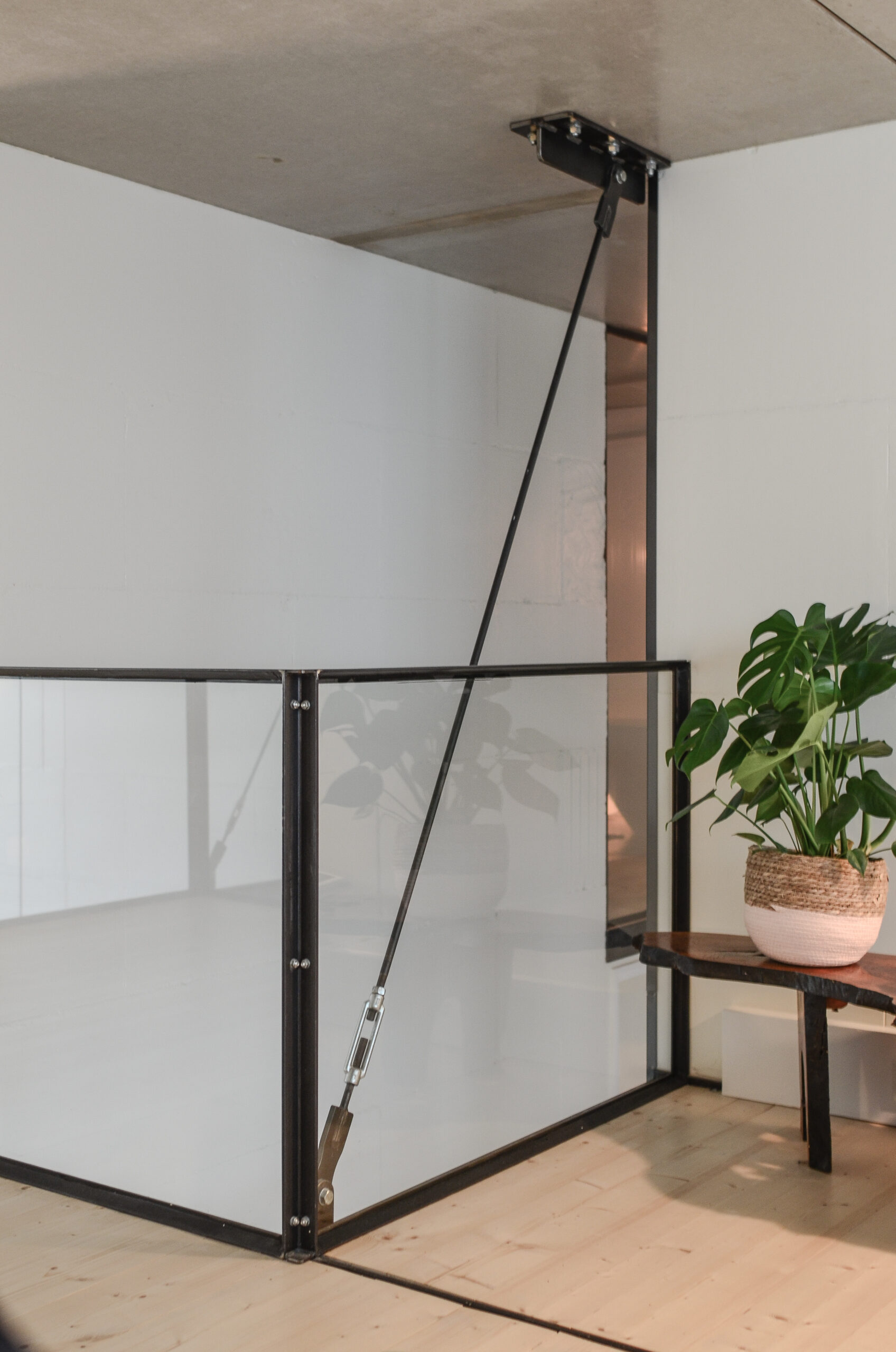 Soms ontstaan uit noodzaak de mooiste oplossingen. Vloer en plafond moesten worden vrijgehouden van constructie, waardoor een nieuw idee ontstond: De ontmoeting tussen wand en plafond. Het punt waar zwaardere verbindingen kunnen worden gerealiseerd. Door middel van diagonale stalen trekkabels kon de entresol op dit punt worden opgehangen. De vloer bestaat uit holle houten profielen, die zijn opgelegd op stalen L-profielen. Hierdoor werd een dikte van de vloer bereikt van enkel twaalf centimeter.