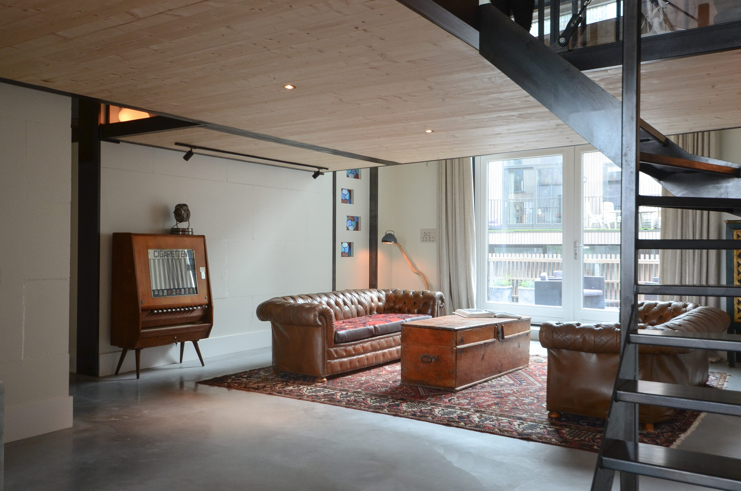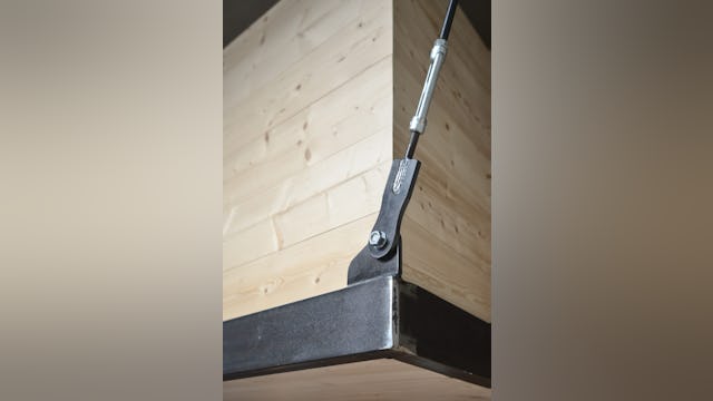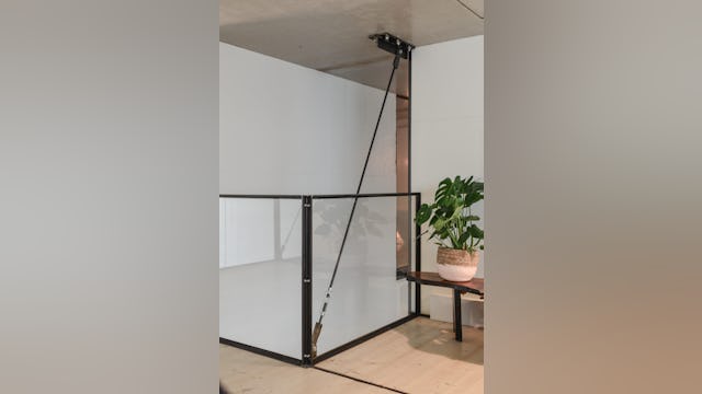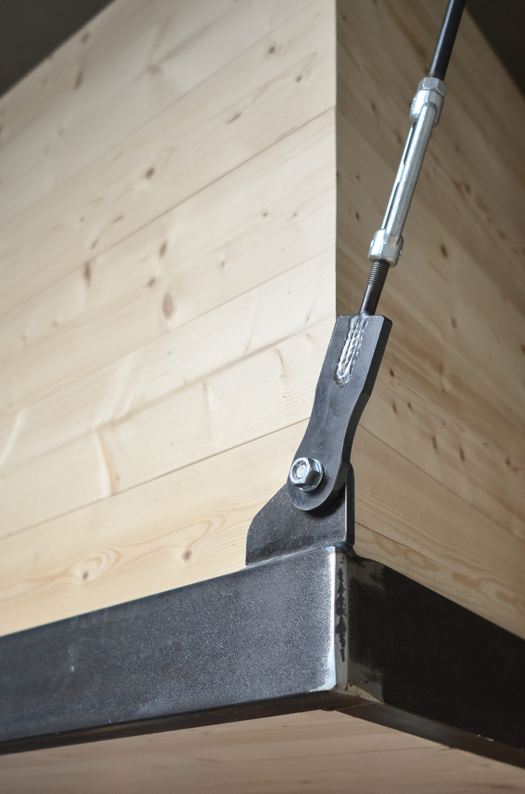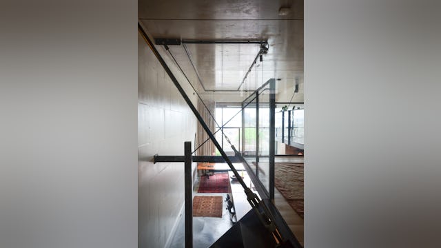 Soms ontstaan uit noodzaak de mooiste oplossingen. Vloer en plafond moesten worden vrijgehouden van constructie, waardoor een nieuw idee ontstond: De ontmoeting tussen wand en plafond. Het punt waar zwaardere verbindingen kunnen worden gerealiseerd. Door middel van diagonale stalen trekkabels kon de entresol op dit punt worden opgehangen. De vloer bestaat uit holle houten profielen, die zijn opgelegd op stalen L-profielen. Hierdoor werd een dikte van de vloer bereikt van enkel twaalf centimeter.