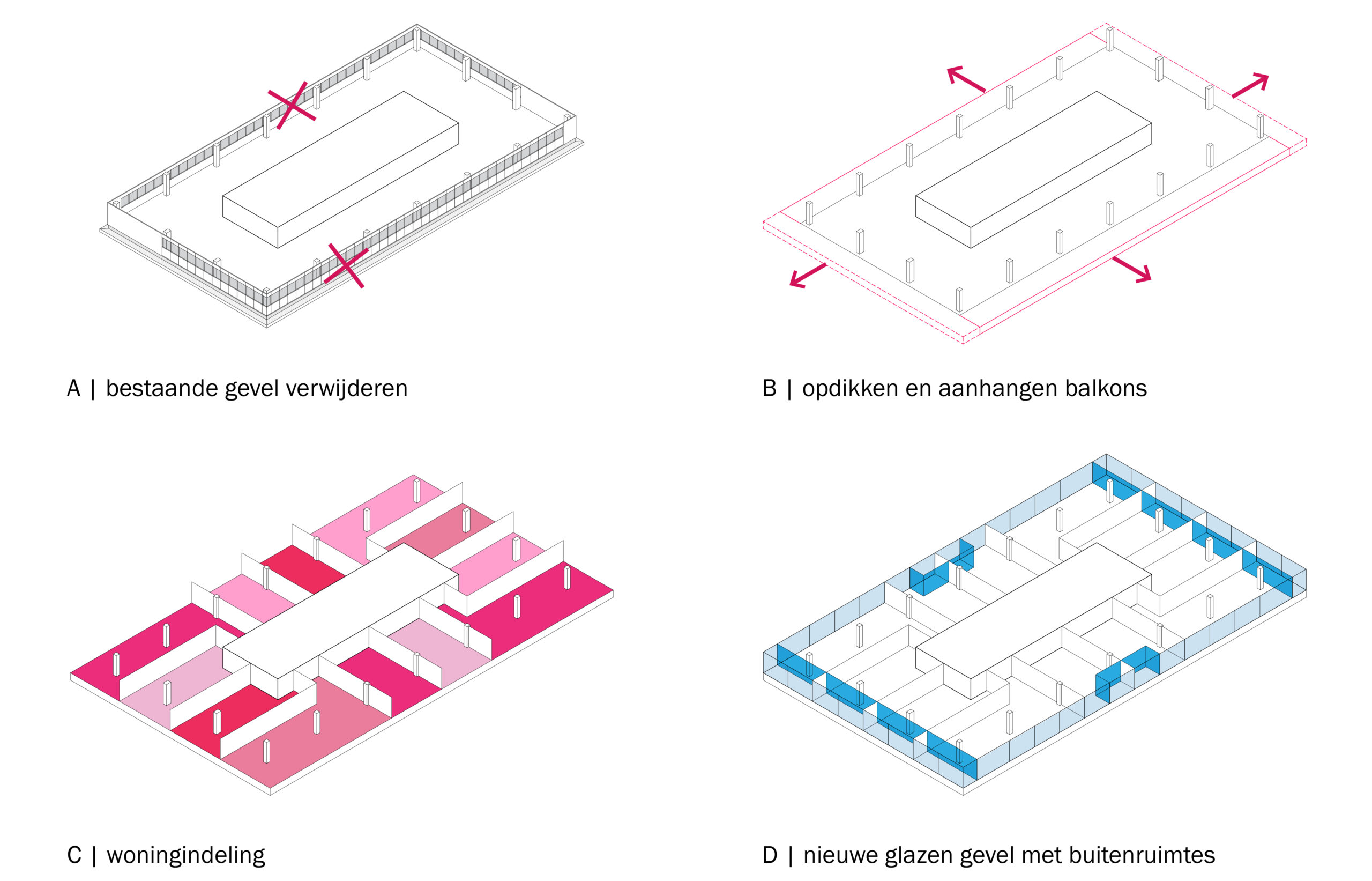 Met IMd is intensief samengewerkt om logische plekken te vinden om de kern te doorbreken en extra hoogte te maken, zonder de hoofddraagconstructie (en voorspanwapening, specifiek voor de JackBlock methode) in gevaar te brengen. Samen met Metaglas is een gevel ontwikkeld, waarbij met eenzelfde profiel riant grote schuifpuien gemaakt zijn, die zowel horizontaal als verticaal schuiven. Zo ontstaat veel afwisseling met maar heel weinig verschillende details en tegelijkertijd een betaalbare gevel.