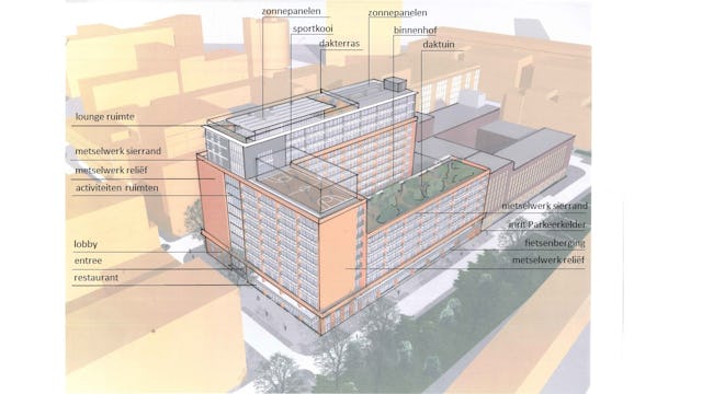 Het gebouw is geheel onder keldert, heeft een betonnen casco, gevels van baksteen en veel glas in aluminium kozijnen. De galerijgevel van het binnenhof is afgewerkt met houten delen. Het ontwerp verwijst naar wederopbouwarchitectuur. Zo is er onder meer op de gevel naast de entree een 12 meter hoog baksteen-reliëf van een dansend paar. Het gebouw slaat met deze architectuurreferentie en de ambachtelijke wijze waarop dit gemaakt is, een brug tussen de geschiedenis en de toekomst van het gebied.