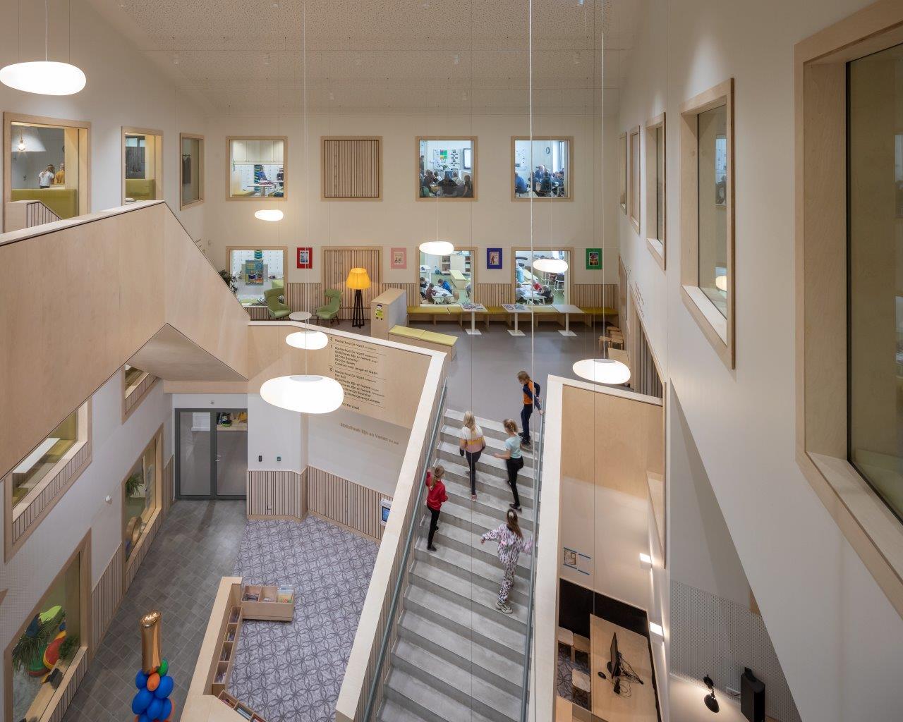 Intern is de ruimte op huiselijke wijze ingedeeld, waarbij plaats is voor verschillende schalen. Zo zijn er plekjes voor één of twee leerlingen, ruimtes voor groepen en een centrum voor iedereen. Morfologisch komt het gebouw zo overeen met Ter Aar. Een sportkantine dient als dorpsplein waaromheen de bibliotheek, de sportzaal en de kindvoorzieningen zijn gelegen. Op dit dorpsplein ontmoeten de bezoekers van het plein elkaar, zowel direct als indirect. Hiermee is het gebouw een dynamisch geheel waarin verschillende functies worden samengebracht.
