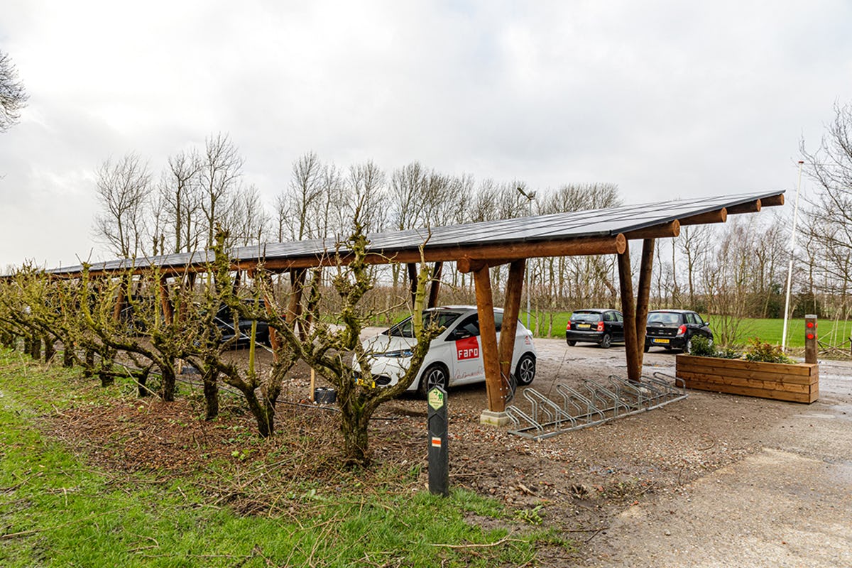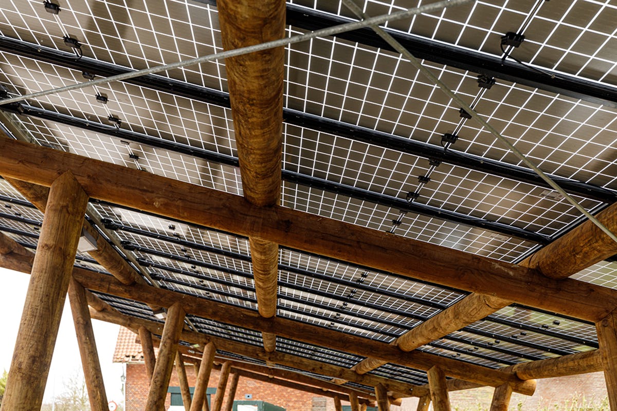 Op deze stoere constructie liggen 144 state-of-the-art zonnepanelen die een waterdicht dak vormen. Doordat de panelen tussen de cellen translucent zijn, komt er mooi gefilterd daglicht door het dak. Onder de zonnecarport is plek voor 12 ruime parkeerplaatsen met op de kop een stalling voor (elektrische) fietsen. Zo ontstaat met de toepassing van zonnecellen dubbel grondgebruik.