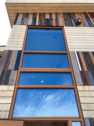 De opvallende houten gevel is gemaakt uit Accoya en hergebruikt hout met wisselende diktes en kleurtinten. Om het kantoorgebouw visueel iets los te weken van de loods heeft een klein tussenvolume een afwijkende gevelbekleding van hergebruikte metalen golfplaten gekregen. De robuuste gevel van de loods bestaat verder uit zogenaamde schaaldelen die overlappen en zijn gemaakt van boomstammen die inclusief schors in de lengte zijn doorgezaagd. Dit zorgt voor een grove natuurlijke uitstraling.