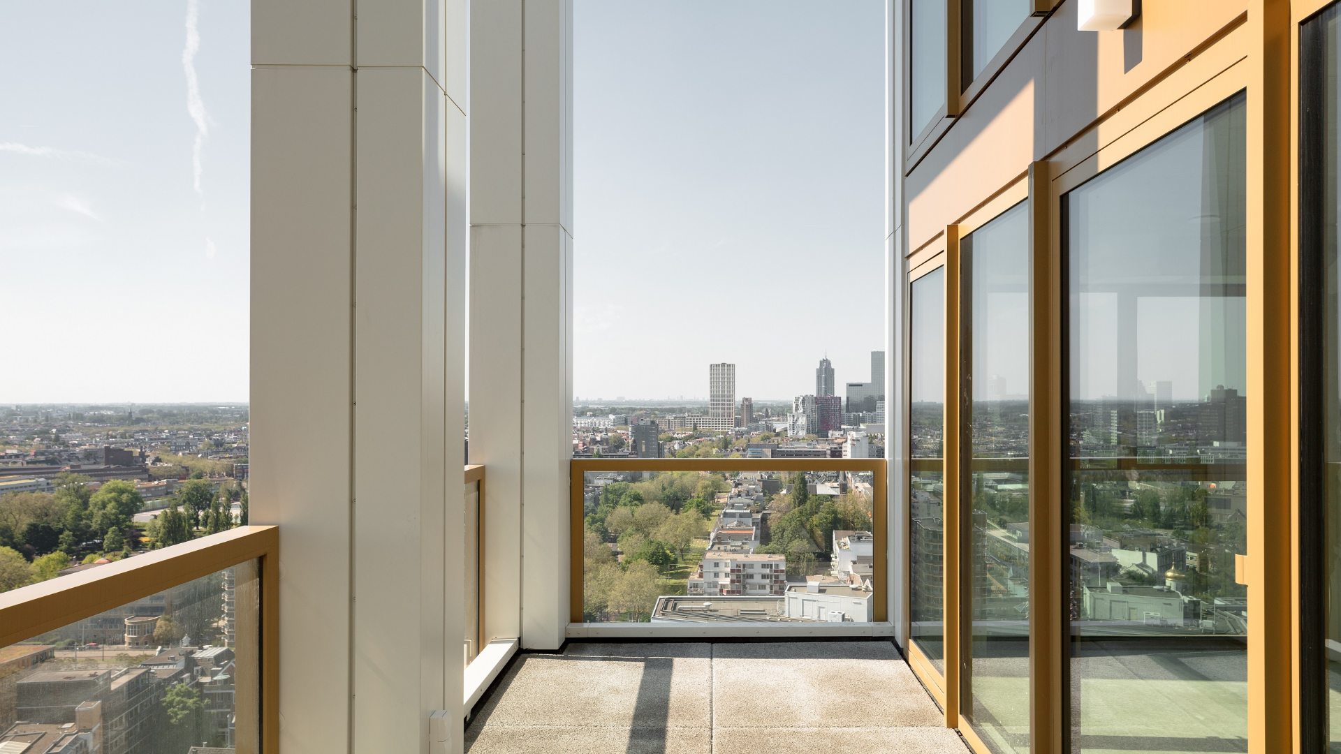 Een uniform palet van lichte kleuren en een herkenbaar gevelpatroon maken dat de plint en de halfhoge torens een eenheid vormen. Het rasterpatroon is geïnspireerd op de sierlijk afgewerkte openingen van de neoclassicistische gebouwen van het Scheepvaartkwartier, maar zorgt voor een eigentijds uiterlijk met de roomwitte aluminium bekleding, bronskleurige kozijnen en verfijnde details. Alle raampartijen hebben driedubbele beglazing, wat tot een lager energieverbruik leidt. De hoge ramen creëren hoogwaardige interieurs met veel daglicht en zorgen ervoor dat alle appartementen een prachtig uitzicht bieden.