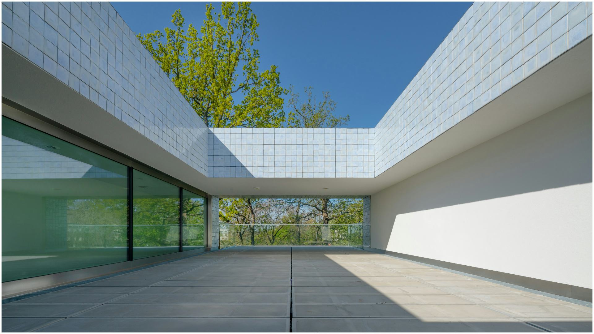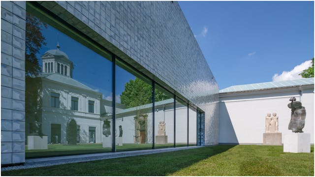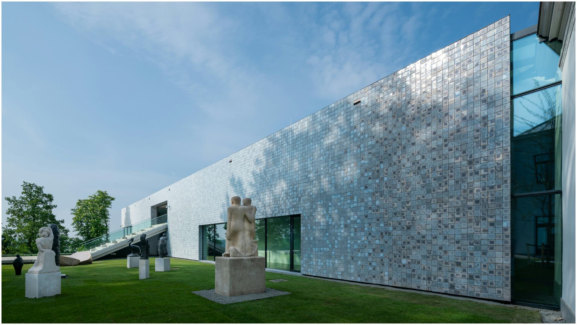 Naast de bijzondere zwevende vleugel die ver uitkraagt boven de stuwwal en een publieke brede trap die deze met de vernieuwde beeldentuin verbindt is ook de gevel een blikvanger. De nieuwe vleugel is betegeld met 82.000 unieke, met de hand vervaardigde tegels. Het bijzondere kleurverloop van de tegels op de gevel – van aardse tinten aan de walkant tot ijsblauw aan de zijde richting de rivier, symboliseert de locatie van het museum op de door een gletsjer ontstane stuwwal. De combinatie van deze natuurlijke kleuren met de vorm zorgen ervoor dat het gebouw vloeiend overgaat in de natuur eromheen.