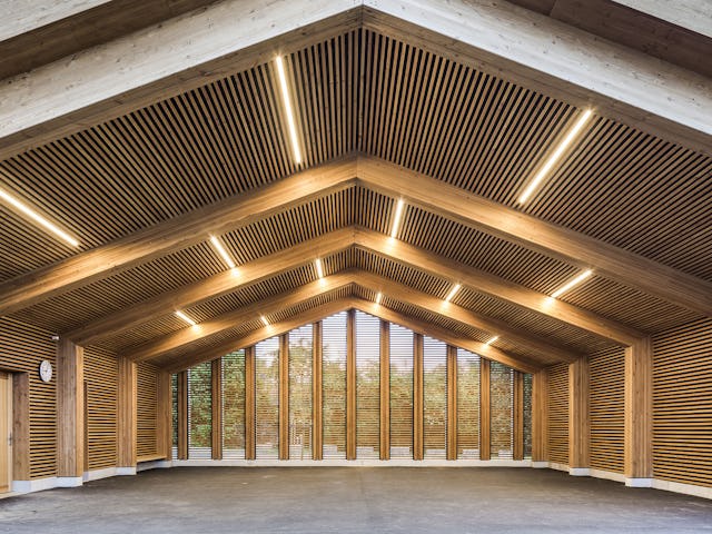 Het structurele systeem in portieken, door de totale afwezigheid van een tussenliggend lagerpunt, maakt deze toekomstige evolutie en een volledige modulariteit van het pand mogelijk. De gevels en het dak zijn opgebouwd uit modules die off-site voorgemonteerd zijn en een combinatie zijn van lucht-/waterdichtheid, isolatie en structuur. De stukken van 5x2 m, ontwikkeld in 3D met de timmerman, hebben het mogelijk gemaakt de bouwtijd te beheersen.