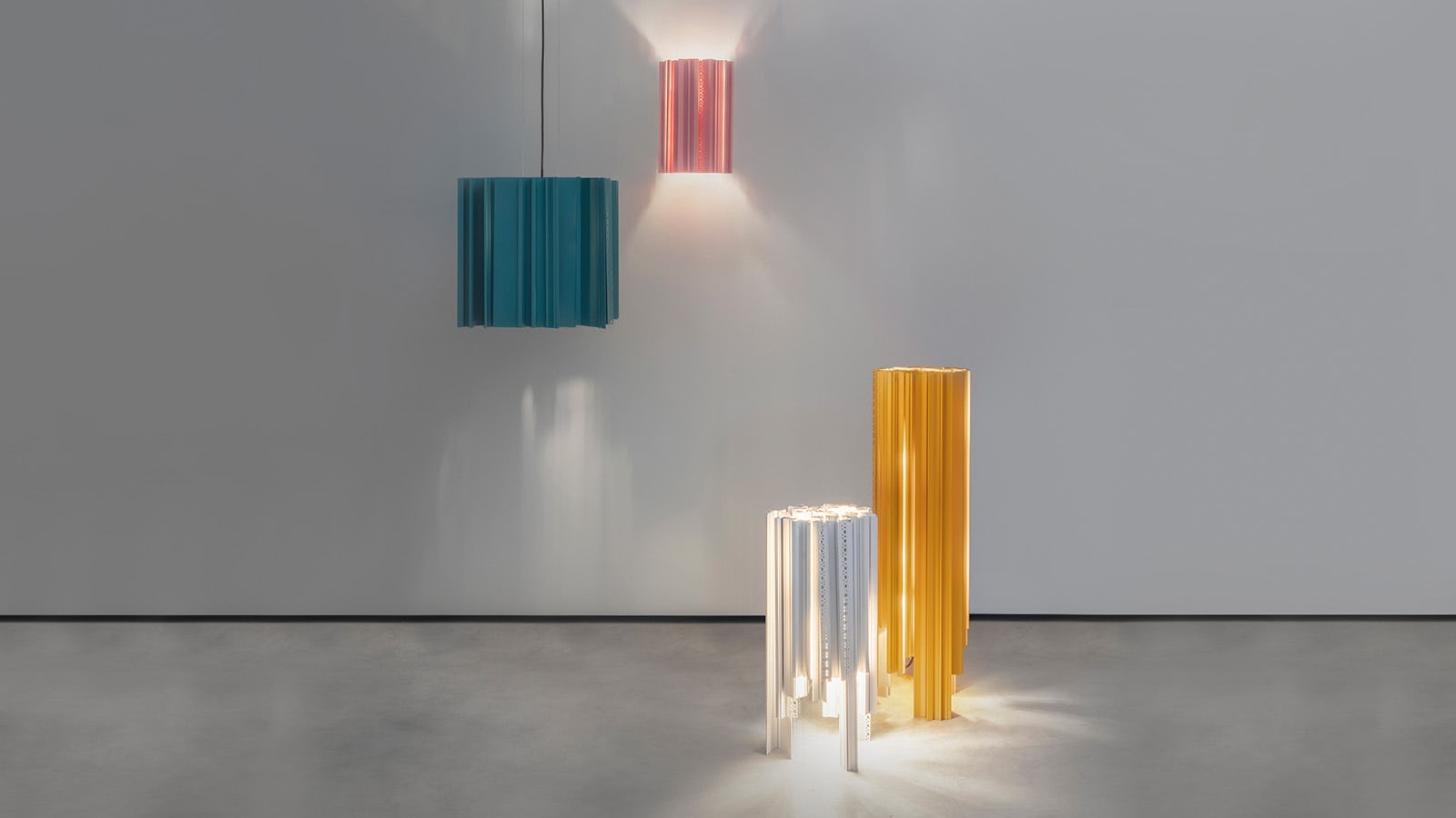 Aluminiumprofielen vormen een belangrijk onderdeel bij de productie van armaturen, maar vaak blijven er snijresten over als restproduct. Dit restafval vormde het uitgangspunt van het ontwerp. Door de profielen te variëren in schaal en grootte, kon de High Profile-serie worden gecreëerd: een kubusvormige pendelarmatuur, een wandlamp in de vorm van een boog, en een vrijstaand model met naast elkaar geplaatste profielen.