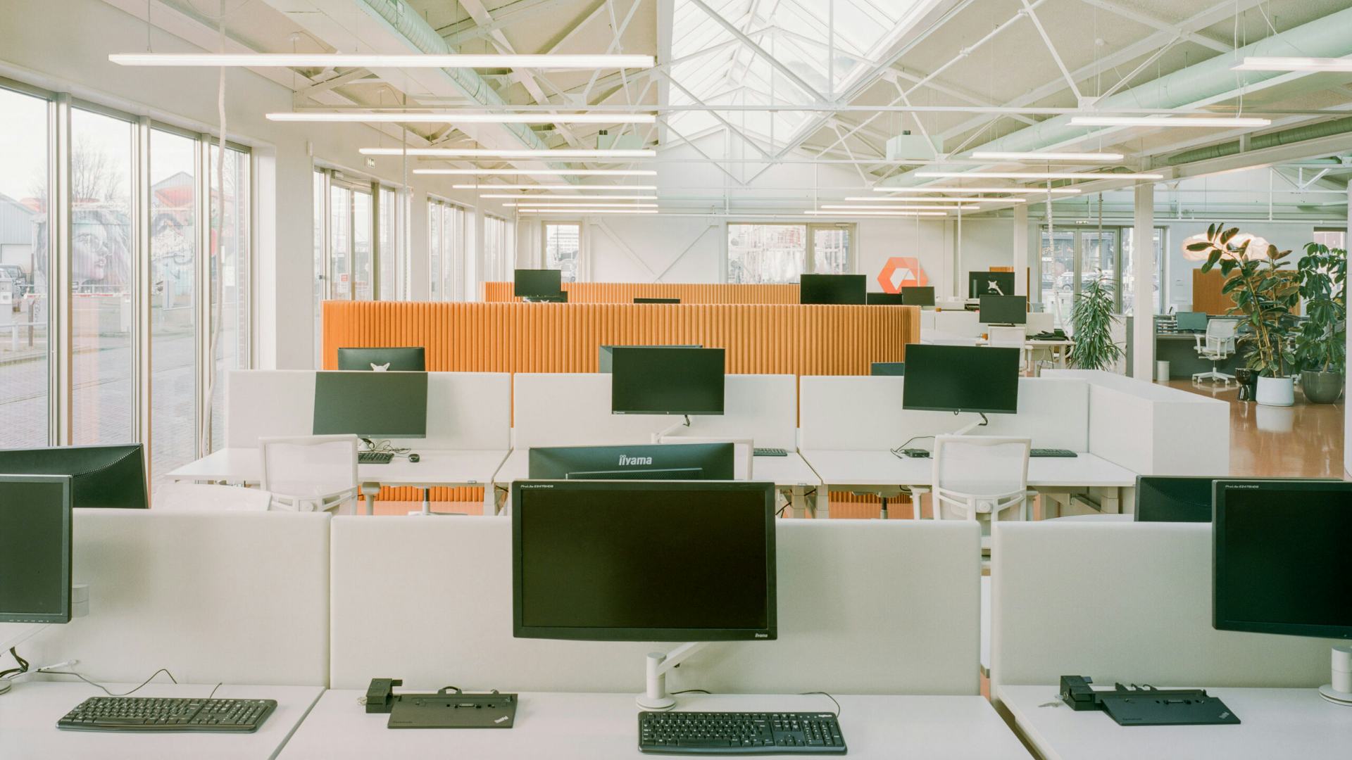 We hebben aan de zuidgevel ramen geplaatst die tot op de grond reiken, extra dakramen toegevoegd en alle binnenmuren verwijderd om de oorspronkelijke staalconstructie bloot te leggen. De laatste van de vier hallen is hoger, waardoor er een extra verdieping mogelijk is. In het midden van de grote ruimte ontvouwt zich een een spiraal met in het hart concentratie-kamers, volledig geluidsdichte ruimtes die uitkijken op een cactustuin. Langs de zijwanden vulden we de ruimte met flexibele werkplekken.