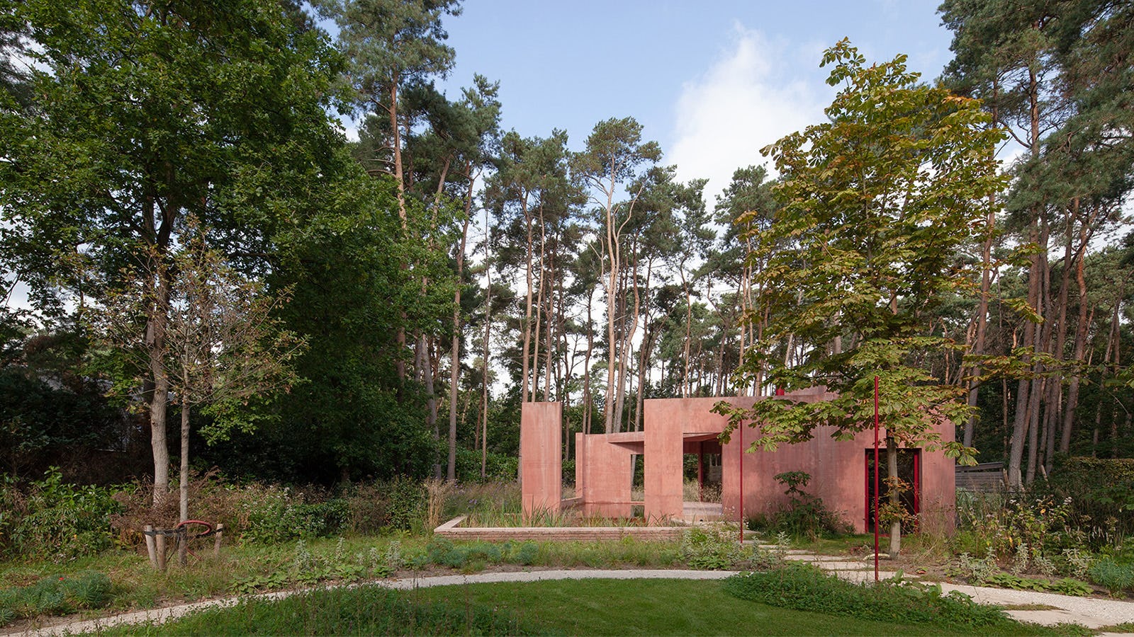 Net als de woning is de refuge een schakel op een nieuw zandkleurig betonpad vanaf de straat tot het yogaplatform. De rode robuuste betonnen schil staat in zacht contrast met de complementaire groene omgeving. Het rood is een nuance van de bestaande woning. Het grote schuifraam in de refuge staat in lijn met de woning en deelt het paviljoen op in een hard exterieur en een zacht, geïsoleerd interieur. De metalen elementen die in het landschap tevoorschijn komen hebben dezelfde paarsrode kleur.