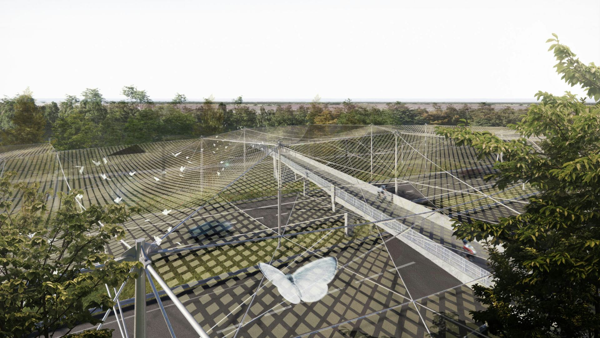 The Butterfly Effect is een lichte overspanning over de snelweg bestaande uit materialen die zonne-energie opwekken. De ruimte voor infrastructuur wordt daarmee dubbel gebruikt voor het opwekken van duurzame energie. Via een web van kabels – in connectie met de boomtoppen – kunnen insecten de snelweg veilig oversteken. Fijnstof en stikstof dalen minder ver neer op het landschap en een bosstrook langs de weg vangt het geluid op. De biodiversiteit wordt zo versterkt en de geluidsoverlast neemt af.