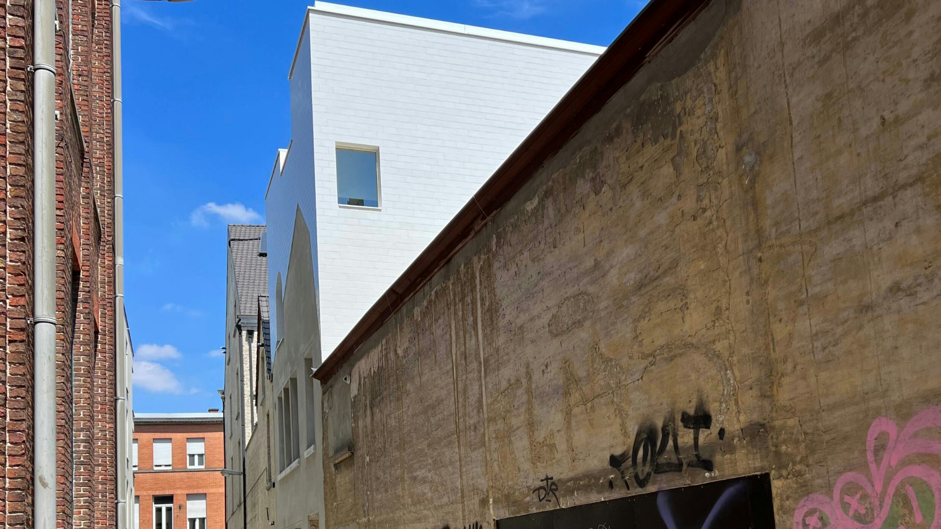 De details vloeien volgens ons voort uit de benadering van het project en bijgevolg uit de materialiteit. In de straat opteren we voor een bescheiden artisanale materialisatie ter hoogte van het oude gedeelte, met daarboven een glossy hedendaagse detaillering, die zorgt voor een duidelijke toevoeging en meer licht in de steeg.