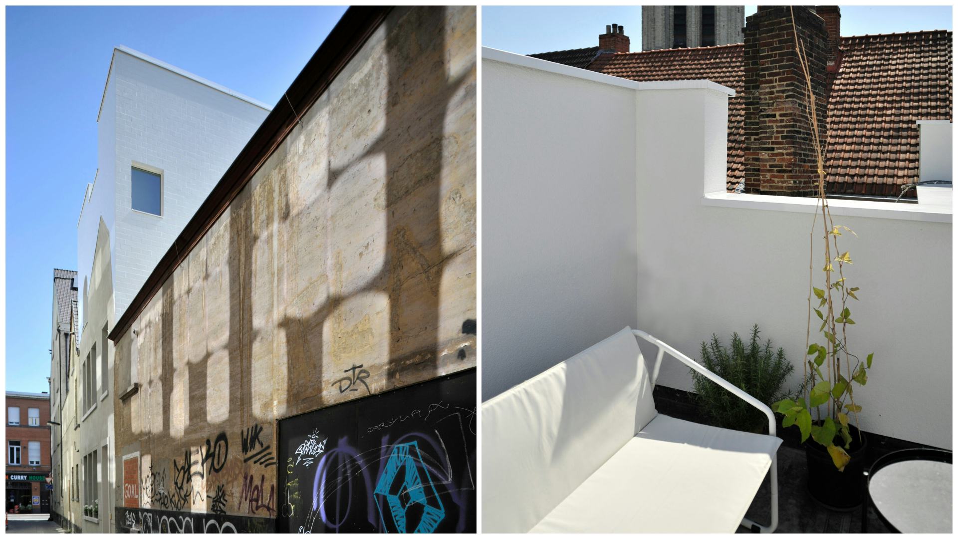 Het pand nestelde zich tussen de hoge muren van de steeg en ging met zijn dakvorm in dialoog met een aanpalende dienstwoning. Voor ons was het bijzonder belangrijk om de relatie met de buur en de steeg te behouden en zelf te versterken. Hiervoor hebben we geopteerd om de bestaande gevel zoveel mogelijk intact te laten en met een andere materialiteit in de hoogte te gaan en daar een extra buitenruimte te voorzien, terwijl een patio licht en lucht tot op de eerste verdieping in de woning brengt.