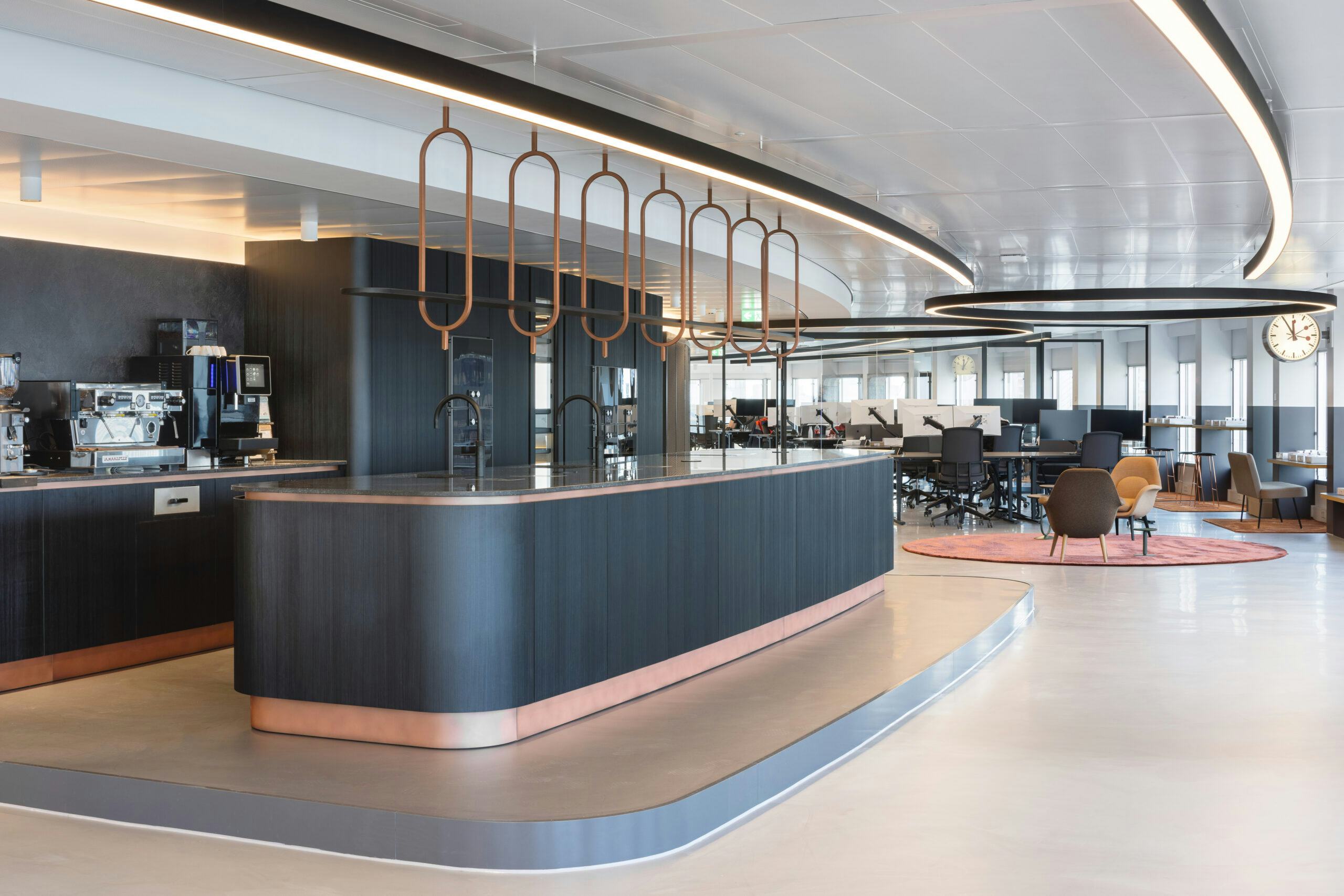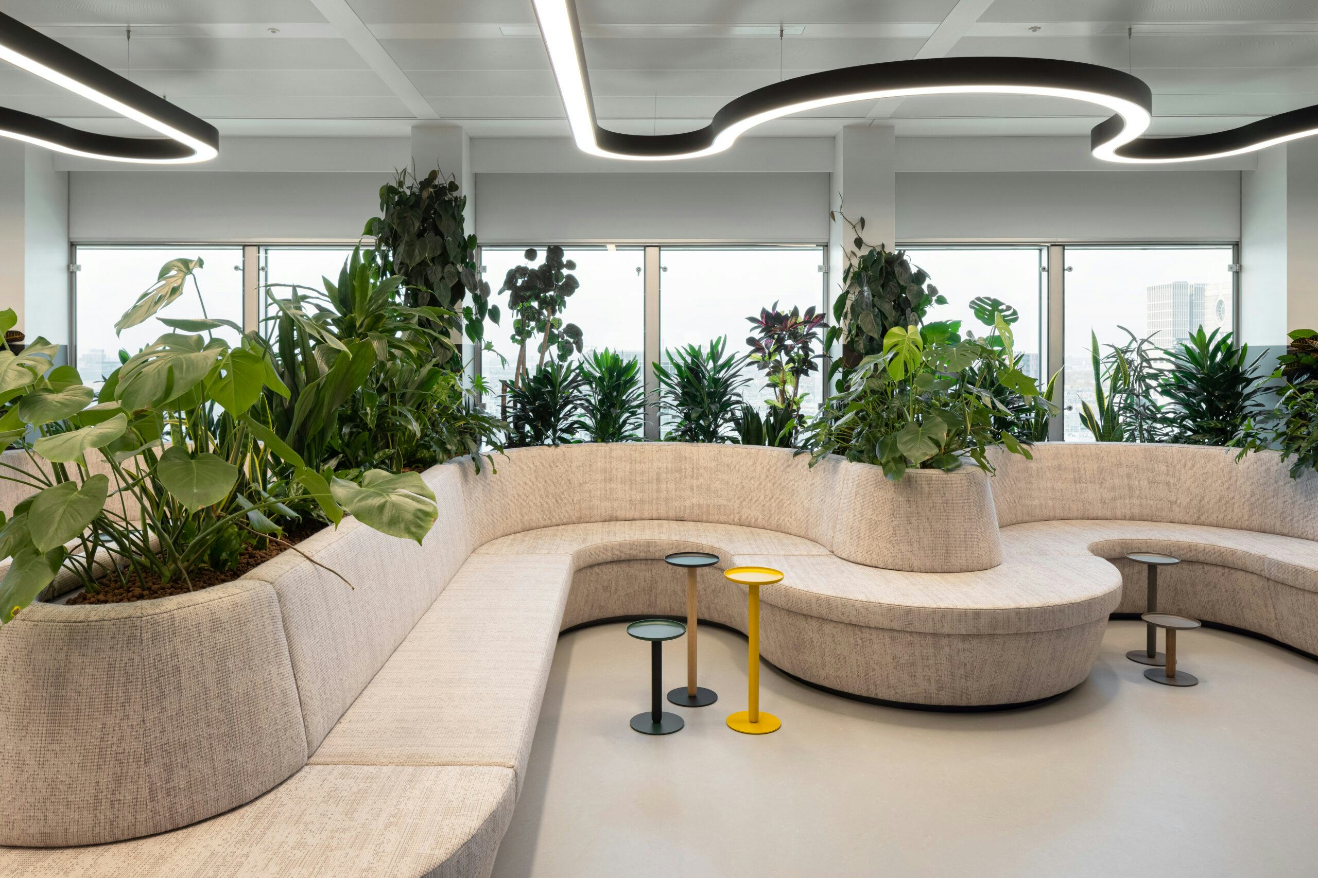 Door op een andere manier met werkplekken om te gaan, hebben we een ruimte ontworpen die anders aanvoelt dan een standaard kantoor. Zo hebben we de gevel, met het waanzinnige uitzicht over het centrum van Rotterdam, optimaal benut door hier een combinatie van werk- en aanlandplekken te plaatsen. Dit zorgt voor werkplekken met extreem veel daglicht. De organische vormen uit de huisstijl hebben we terug laten komen in o.a. de pantry, lichtlijnen en de gebogen glazen van de vergaderruimtes.