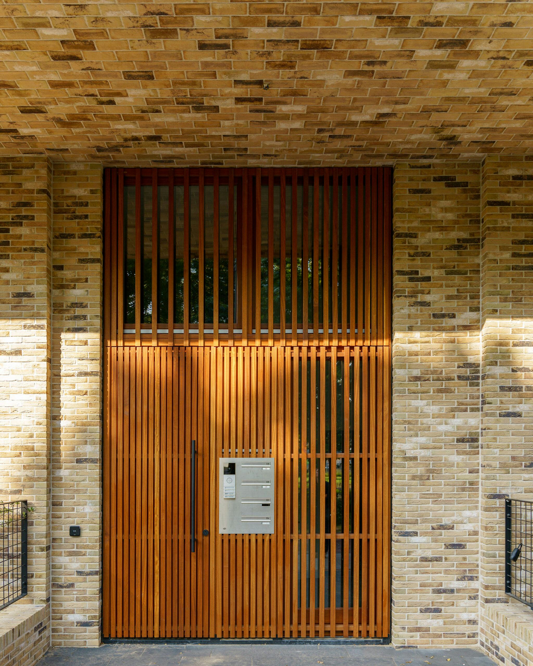 Doordat we met een bepaalde mate van overmaat hebben gewerkt, dat wil zeggen: penanten, een bakstenen kroon/dakrand en muurtjes als begrenzing van het private gebied, ontstaat er een beeld van een statig, zorgvuldig ontworpen gebouw. Door het baksteen als monoliet overal aan te laten sluiten, in combinatie met de grote overhang, krijgt het gebouw een monumentele entree. Precies zoals de gemeente en supervisor voor ogen hadden.