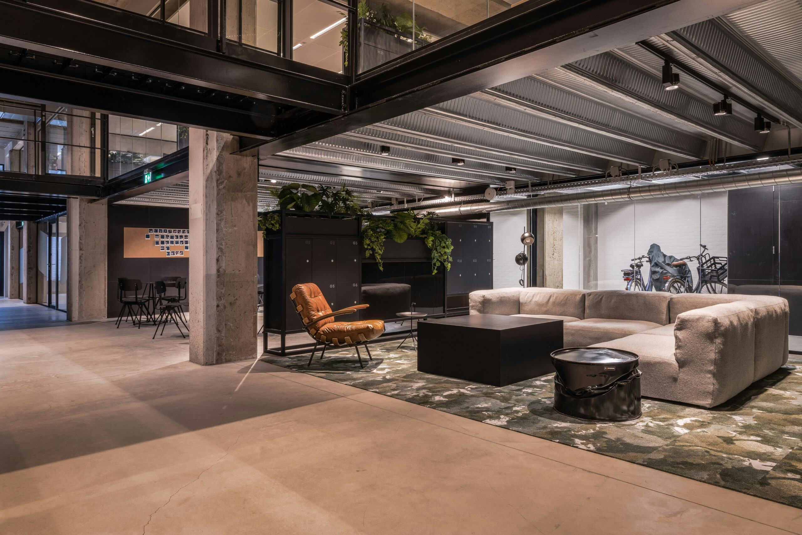 OOK werkt met natuurlijke materialen zoals blank metaal, beton en blank hout die mooi verouderen. Deze ingrediënten passen naadloos op de begane grond. Op de verdiepingen bevindt zich een meer ‘standaard kantoor’ met systeemplafond, glas en een centrale kern. OOK besloot een knip te maken tussen de uitstraling van de verdiepingen en de begane grond, waarbij de herkenbare zwarte kern met veel functies en materialen de constante is op alle verdiepingen.