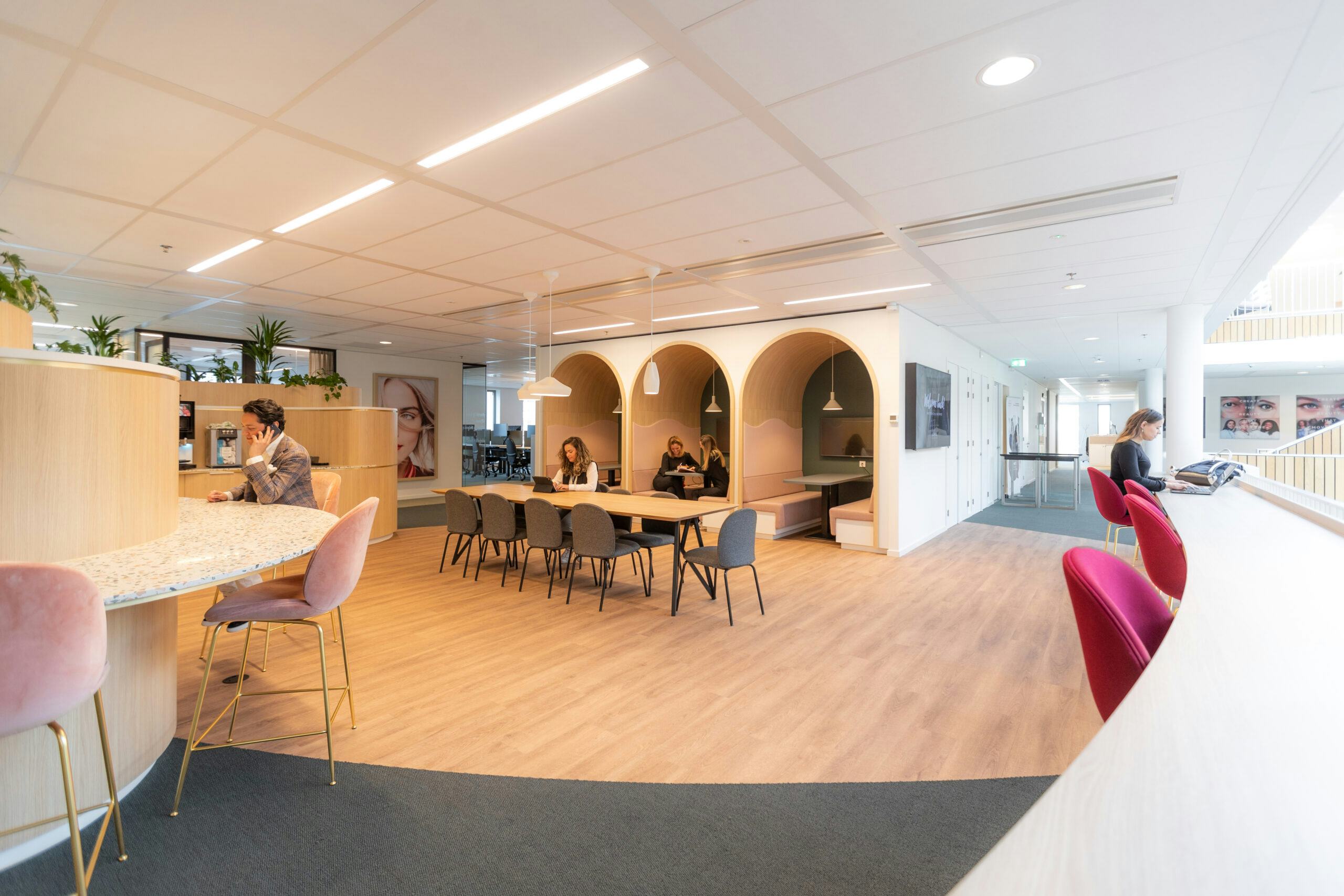 Op basis van de bouwstructuur, het werkplekconcept, de eisen en de wereld van L’Oréal hebben we het meubelplan gemaakt. Eén van de mooiste elementen die het gebouw te bieden heeft is de grote vide die connectie geeft tussen de verschillende verdiepingen. Wij hebben deze openheid behouden door actievere zones zoals bijvoorbeeld een werkcafé aan het Atrium te plaatsen. Deze zone vormt een buffer tussen de verschillende teamgebieden; op akoestisch niveau, levendigheid en activiteiten.