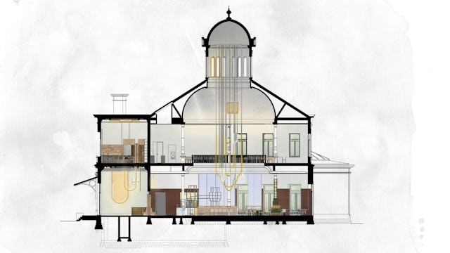 Alle ruimtes van het Museum Arnhem draaien om de iconische museumkoepel. Om de ruimtes die zich over het grote volume verspreiden met elkaar te verbinden maakte Studio Modijefsky een nieuwe designtaal, geïnspireerd door aspecten van de geschiedenis en toekomst van het gebouw. Haar oorsprong als herensociëteit, en het magische realisme dat te zien is in de actuele museumcollectie.