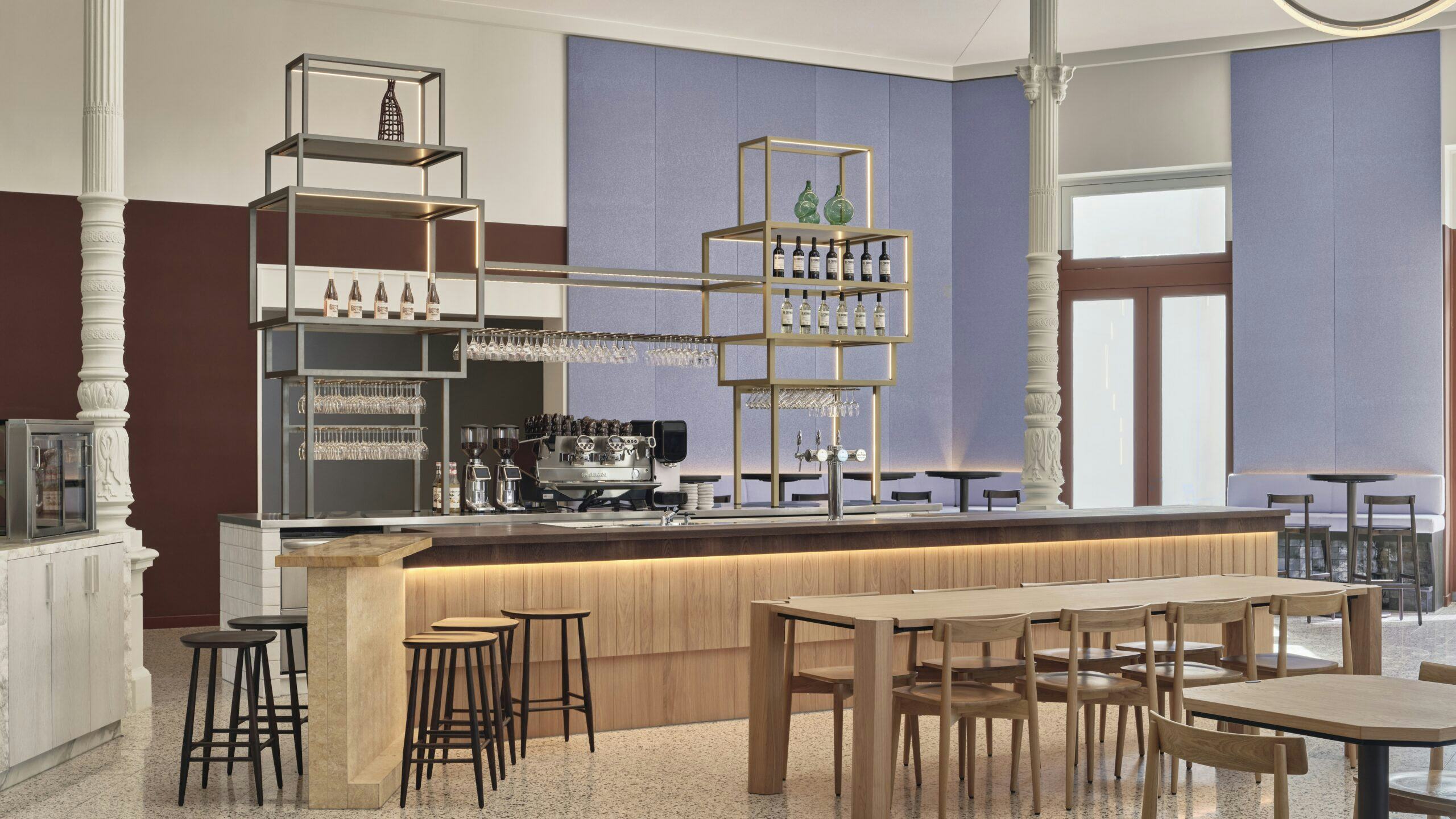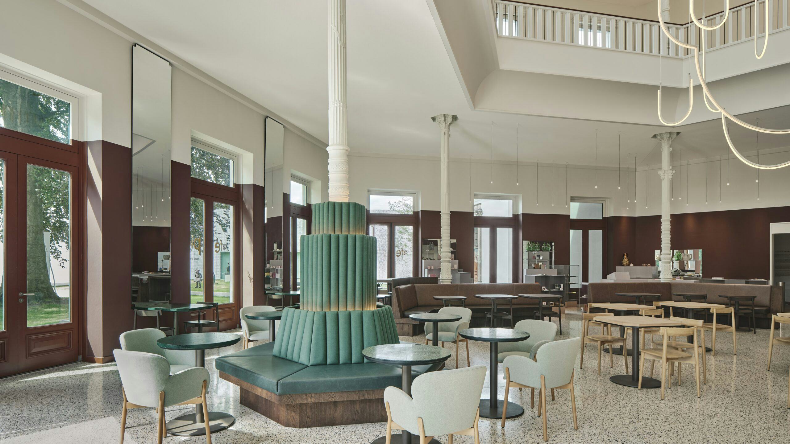 Alle ruimtelijke elementen relateren aan de monumentale kolommen in de ruimte. Deze zijn het enige deel van de bestaande constructie dat bewaard moest worden, en daarom zijn alle banken, meubels en de bar er omheen gepositioneerd. Om de balans tussen hoogte en licht in de koepel te contrasteren zijn de ruimtelijke elementen donker en 'zwaar' ontworpen. Lage en hoge houten tafels zijn op maat gemaakt met lage bankjes, die met vier van de kolommen verbonden zijn.