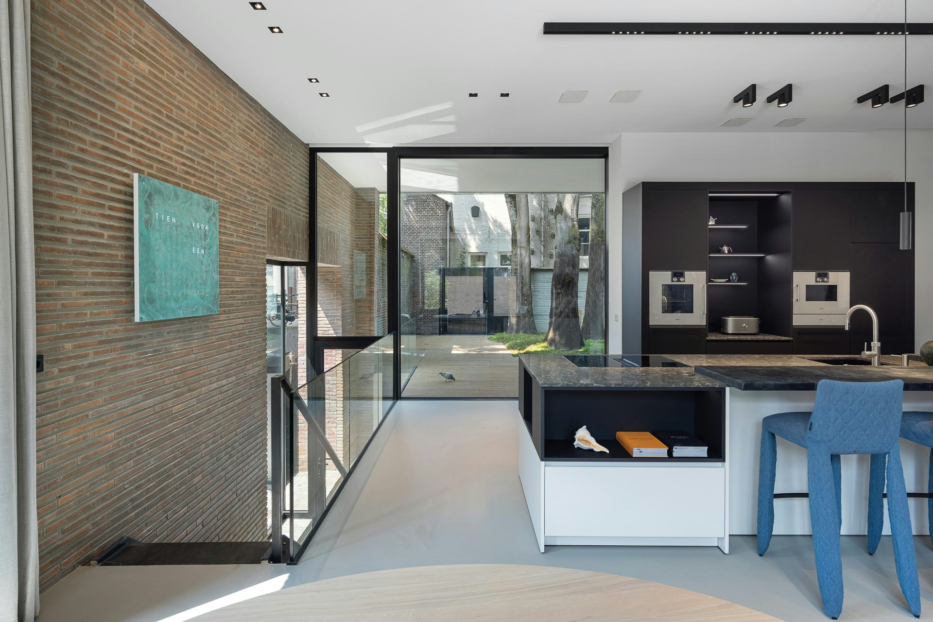 Dankzij een bodemwisselaar en de luchtwarmtepomp geïntegreerd in de ‘schoorsteen’, in combinatie met optimale isolatie en de louvrezonwering, is de woning uiteraard niet op het gasnet aangesloten.