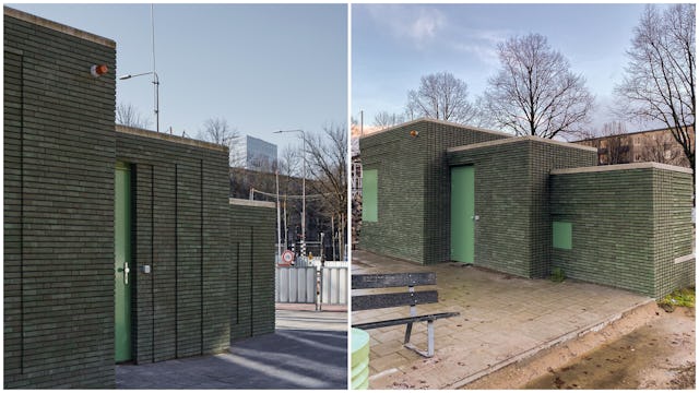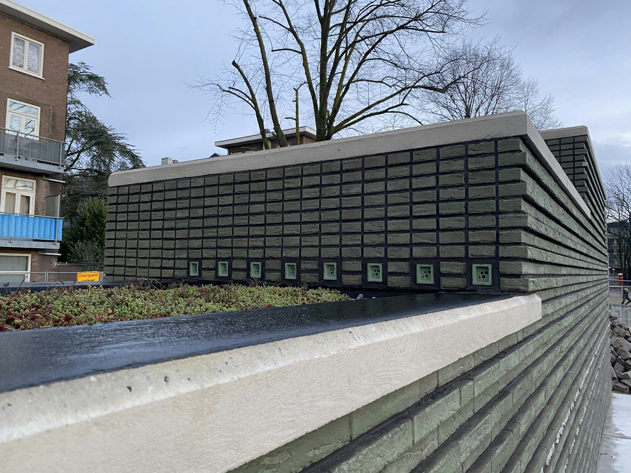 Het dak is bekleed met sedum en verschillende sleuven bieden schuilplaatsen voor insecten en amfibieën. Naast de bijdrage aan biodiversiteit in de wijk is er ook sprake van sociale duurzaamheid. De lange bank schept ruimte voor ontmoetingen in de buurt, waardoor de leefbaarheid wordt vergroot. Het reliëf in het metselwerk vermindert daarnaast de aantrekkingskracht voor wildplakkers en graffitispuiters. Dit zorgt ervoor dat het metselwerk lang mooi blijft.
