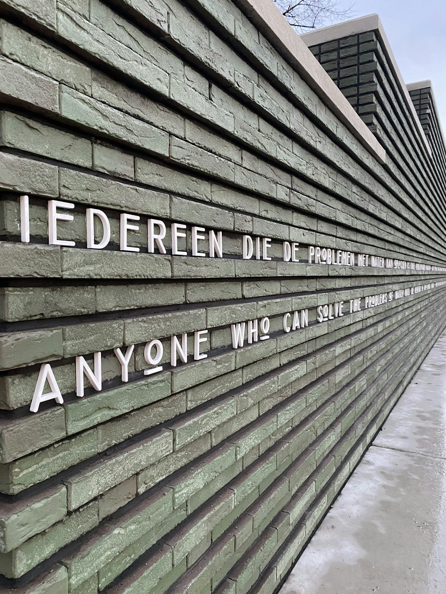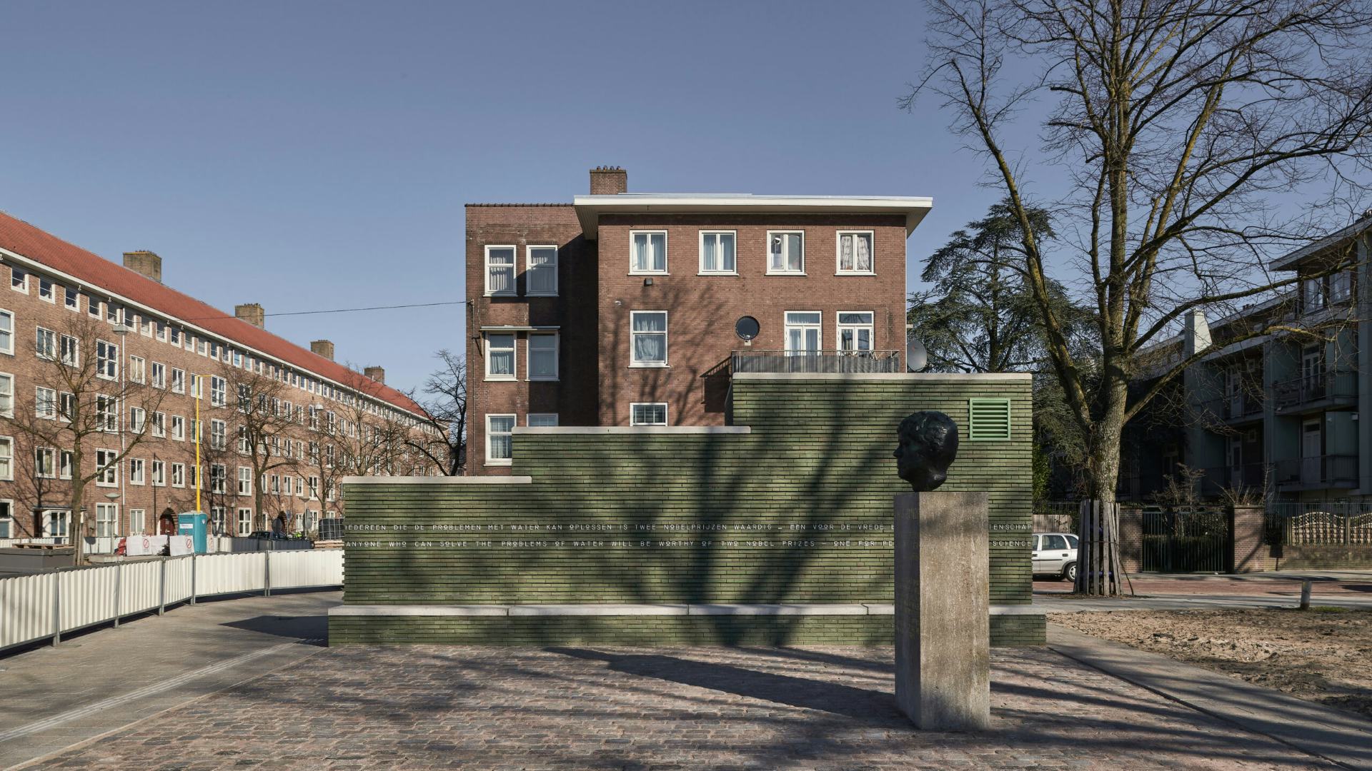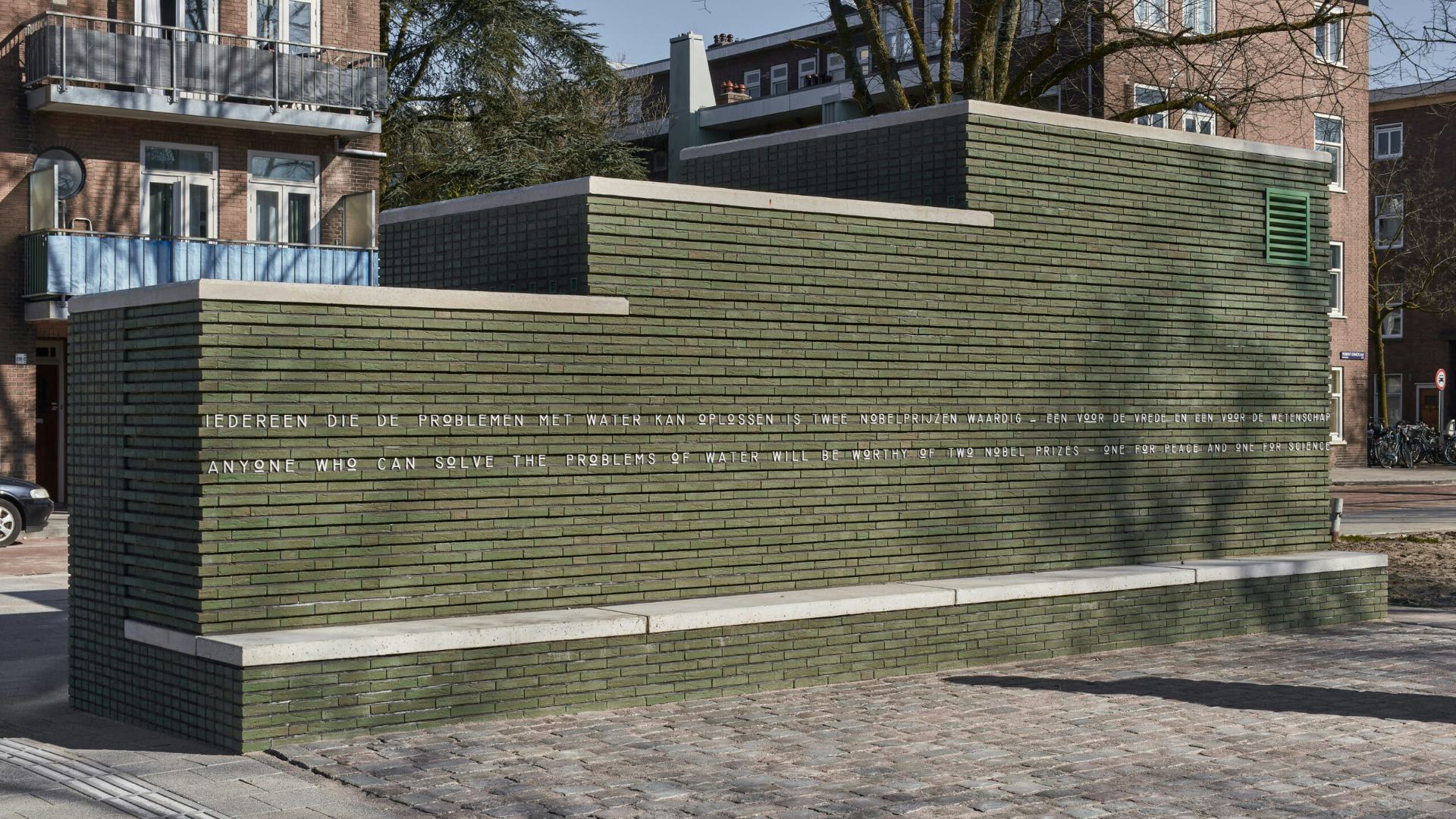 4. ‘‘iedereen die de problemen met water kan oplossen is twee nobelprijzen waardig – één voor de vrede en één voor de wetenschap’’. Het lettertype van de tekst op het metselwerk is zelf ontworpen en een afgeleide van de Amsterdamse School typografie.