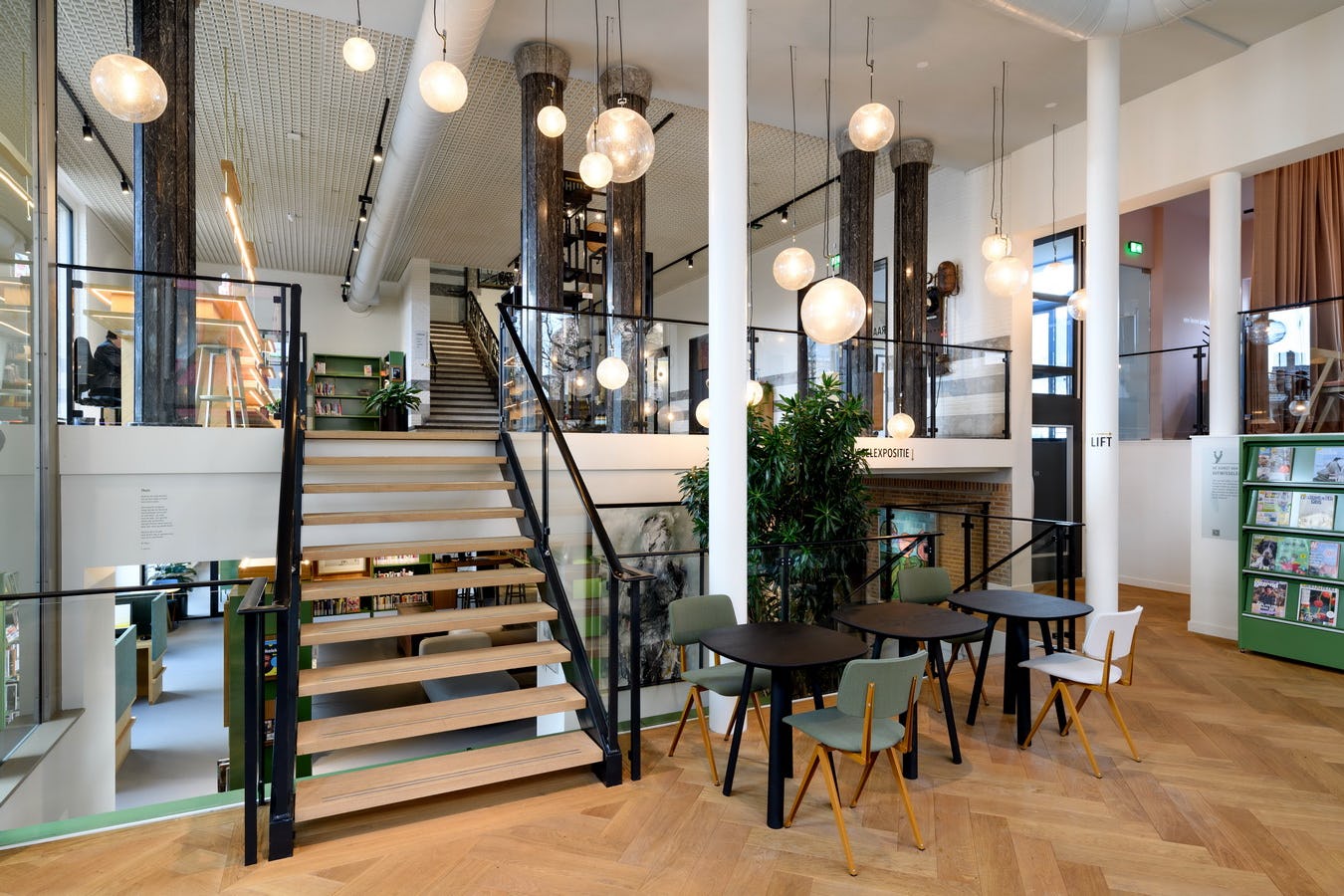 Door een ingenieuze verlaging van een deel van de vloer op de bel-etage tot het niveau van het maaiveld is het gebouw toegankelijk, eigentijds en gebruiksvriendelijk. Hierdoor ontstond een dubbelhoge ruimte voor het leescafé en een entree zonder drempels. Binnen levert het een split-level op waarmee de bel-etage en het souterrain met elkaar verbonden worden. Door de nieuwe vitrineramen in de kopgevel en de nieuwe tuin aan het souterrain is het gebouw open en licht en van alle kanten uitnodigend.