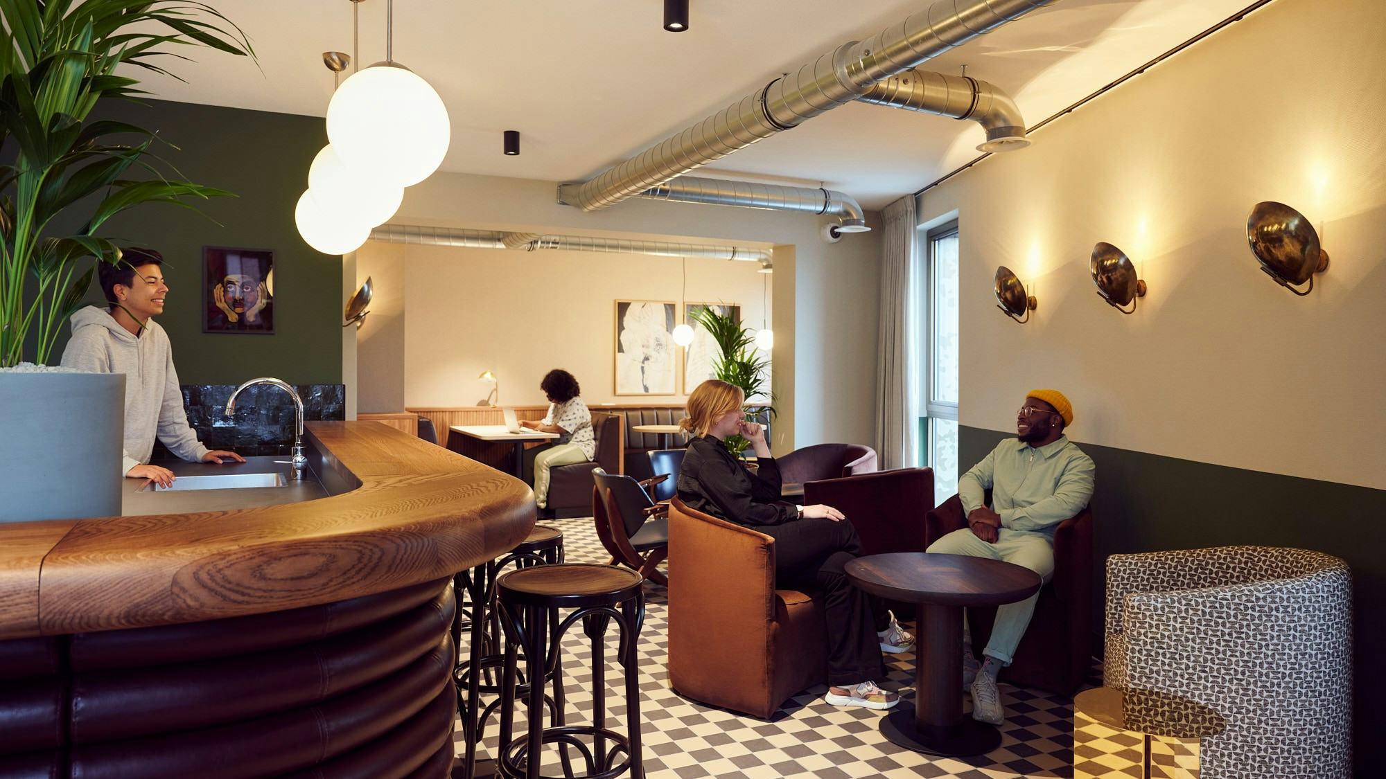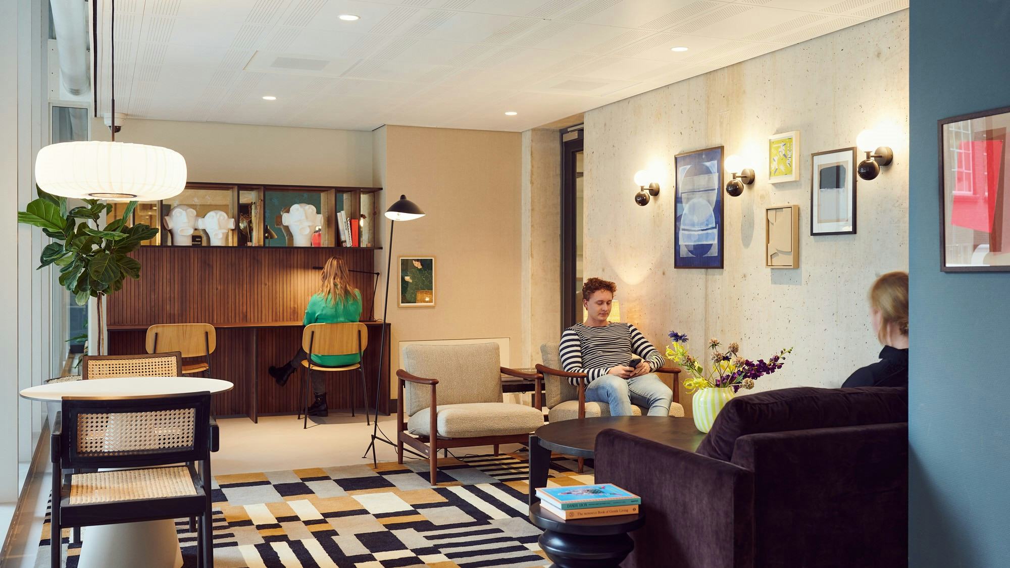 De gekozen vormtaal voor het interieur komt voort uit de stad Rotterdam: raw, geometrical en no nonsence. Dit heeft Pubblik&Vos vertaald naar materialen als beton, cortenstaal, een geblokte tegelvloer en oude balken. Voor de leefbaarheid hebben we daar zachte materialen tegenover gezet; grote tapijten, noten gebeitst hout en gestoffeerd meubilair. Daarnaast is kunst en aankleding van groot belang. Op meerdere plekken herken je de geometrische vormentaal uit het concept.